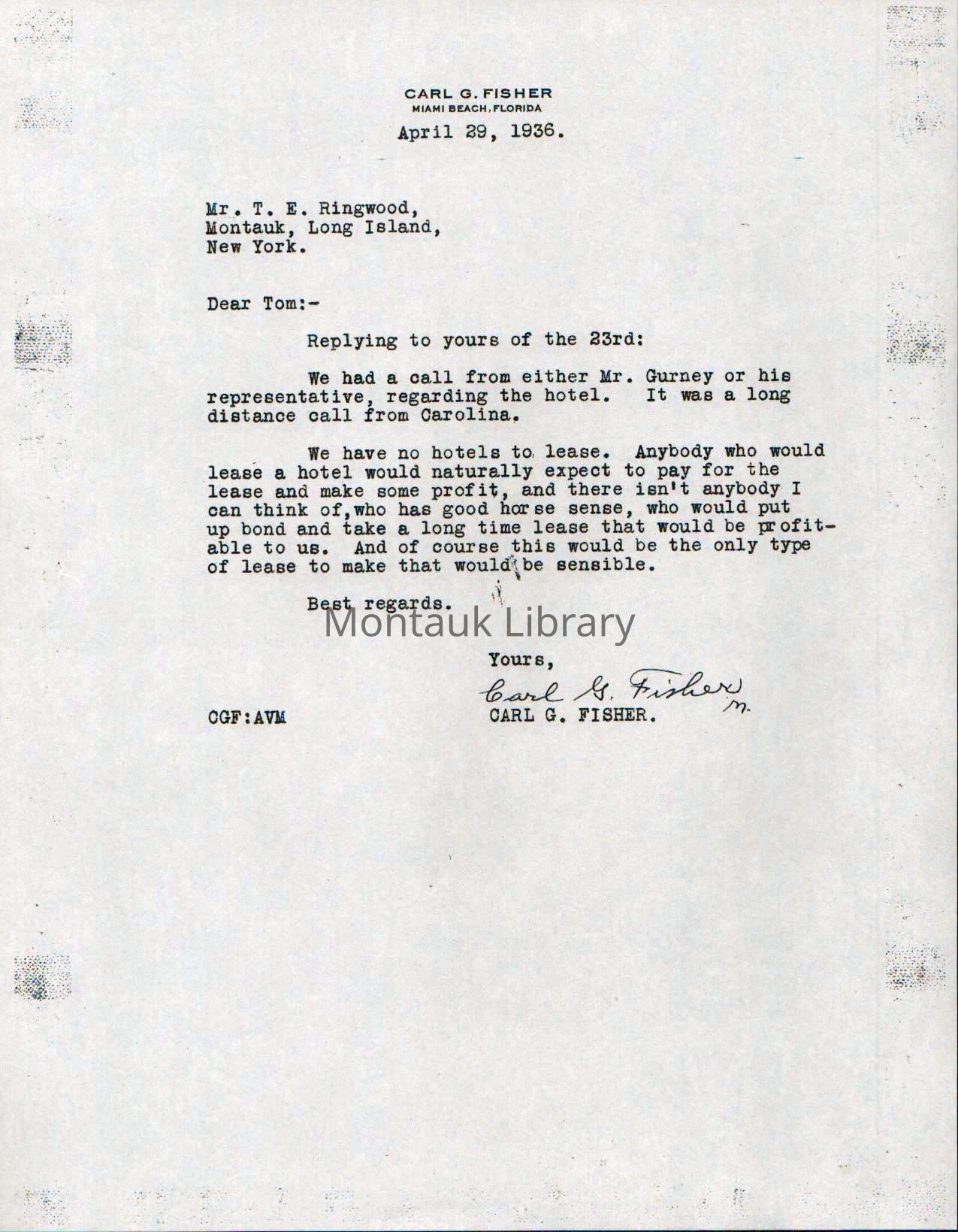 A collection of correspondence primarily from Carl G. Fisher and T. E. Ringwood relating to real estate development, personal matters, and the activities of the Montauk Beach Development Company and the Carl G. Fisher Corporation (Miami) from 1935 to 1939. Topics include real estate sales, Miami Beach building reports, Carl G. Fisher corporation finances, road conditions, summer cottages, potato planting, lumber and building supply quotes, speaker engagements, complaints about the unseasonably cold summer season, and dissatisfaction with development from the long withstanding Montauk residents. A majority of the collection consists of correspondence between Carl G. Fisher and T. E. Ringwood. Additional correspondents of note include Miss Elizabeth Agnew (owner of Weeweechu Tea House), Robert Moses, Richard T. Gilmartin, lieutenants and captains of the U.S. Marine Corps, and F. R. Humpage (Treasurer, Carl G. Fisher Corp in Miami).Archive Details