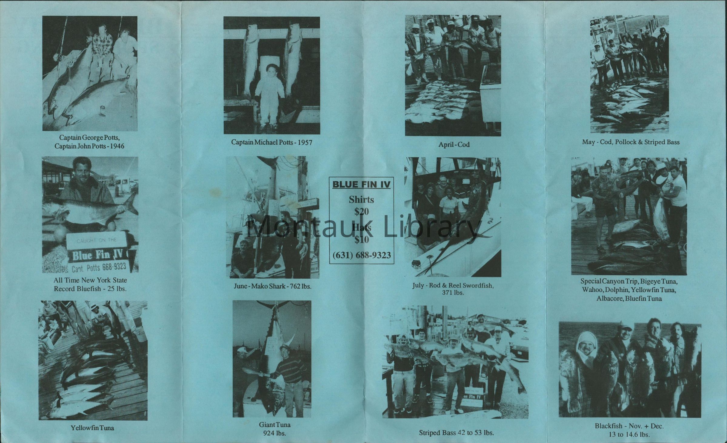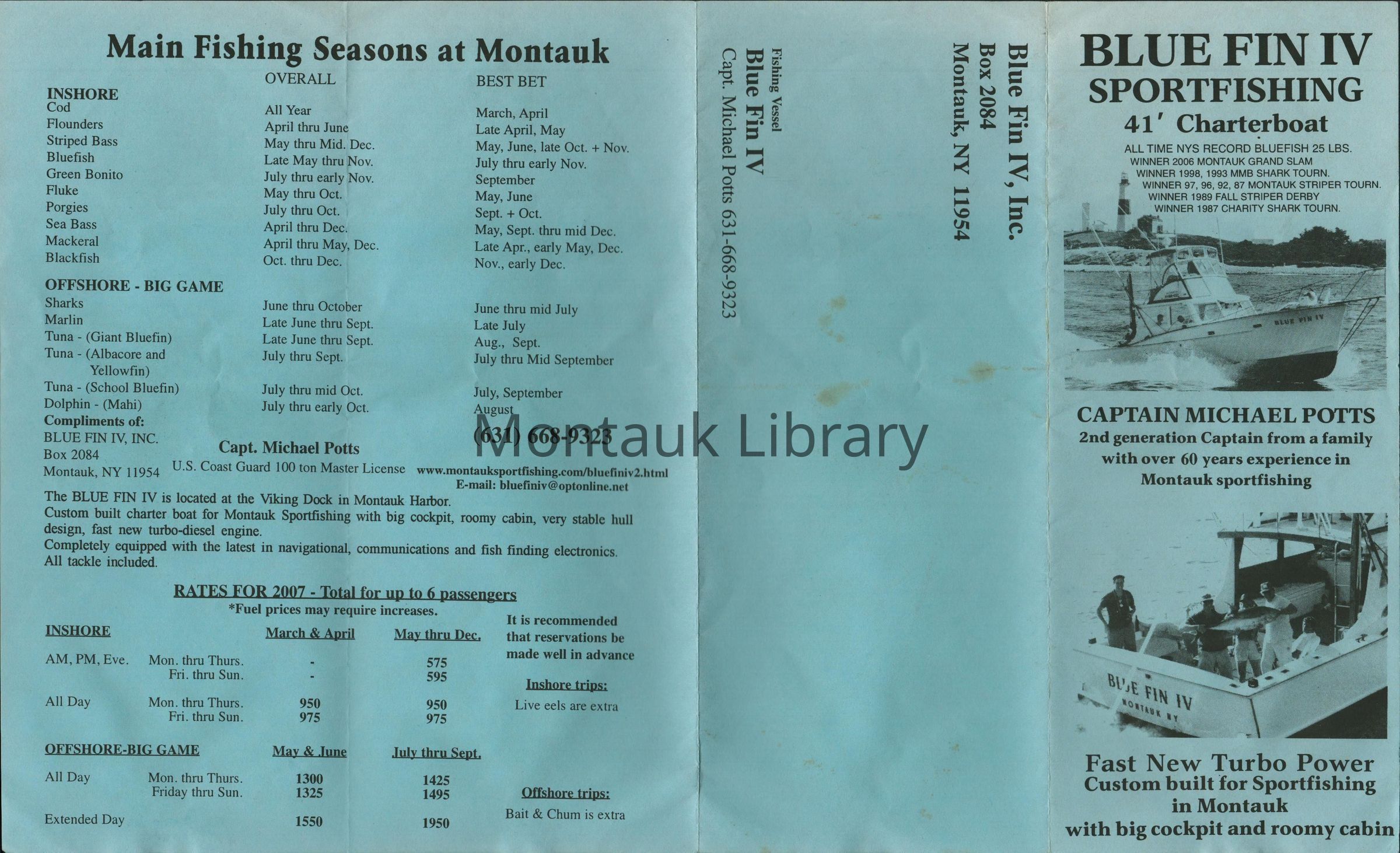 A promotional brochure for charter services aboard the Blue Fin IV Sportfishing 41' charter boat operated by Capt. Michael Potts. Includes fishing seasons, rates, and photographs of past catches.Publication Details