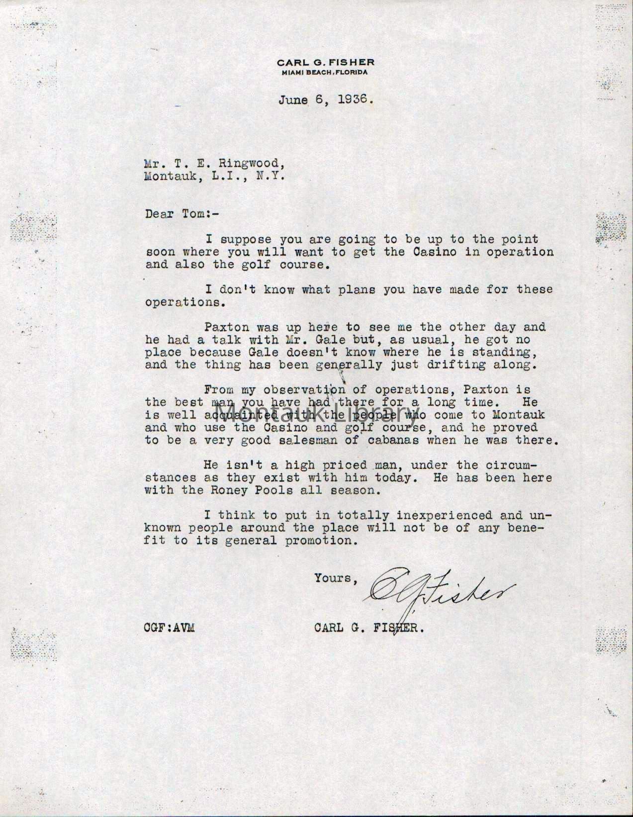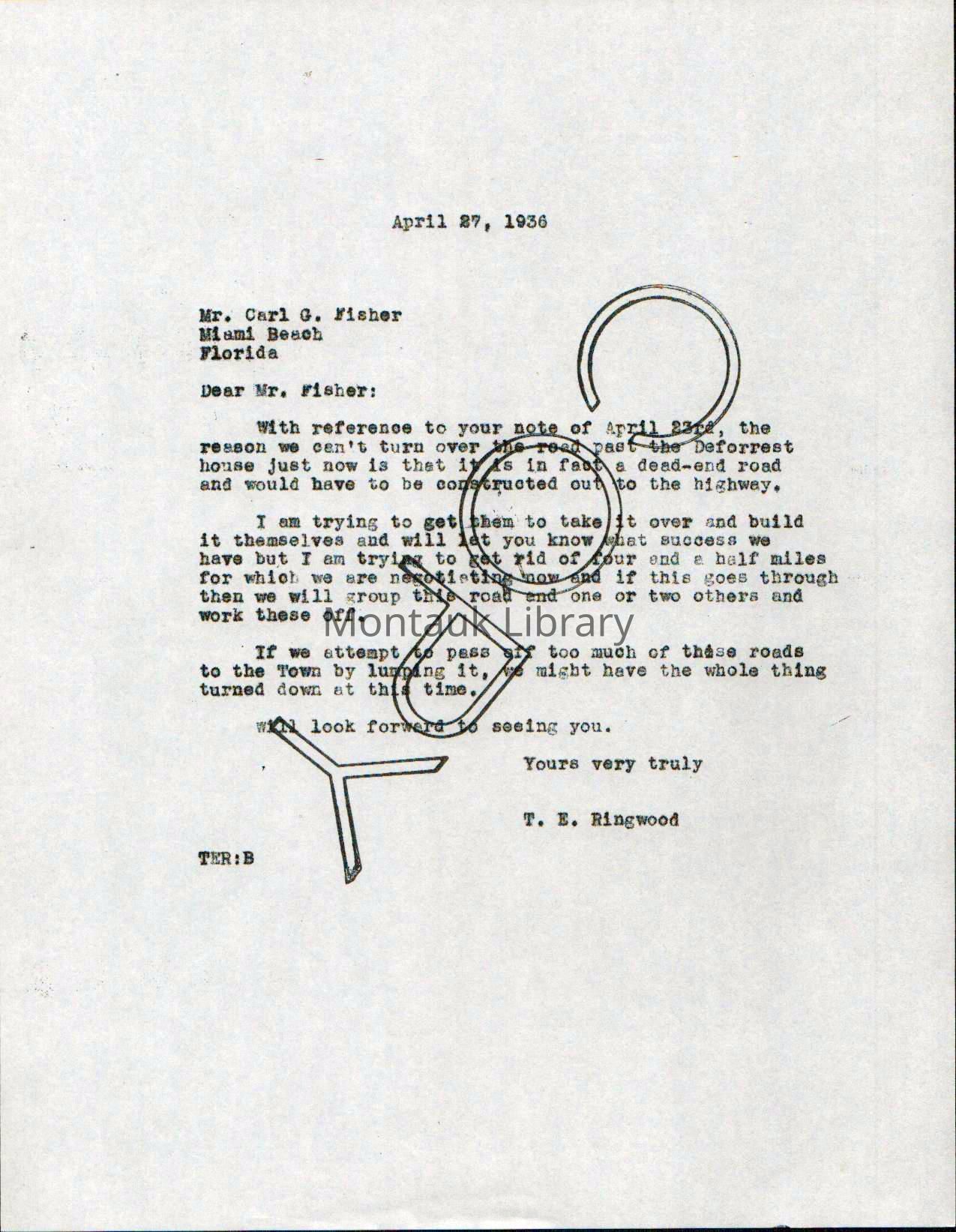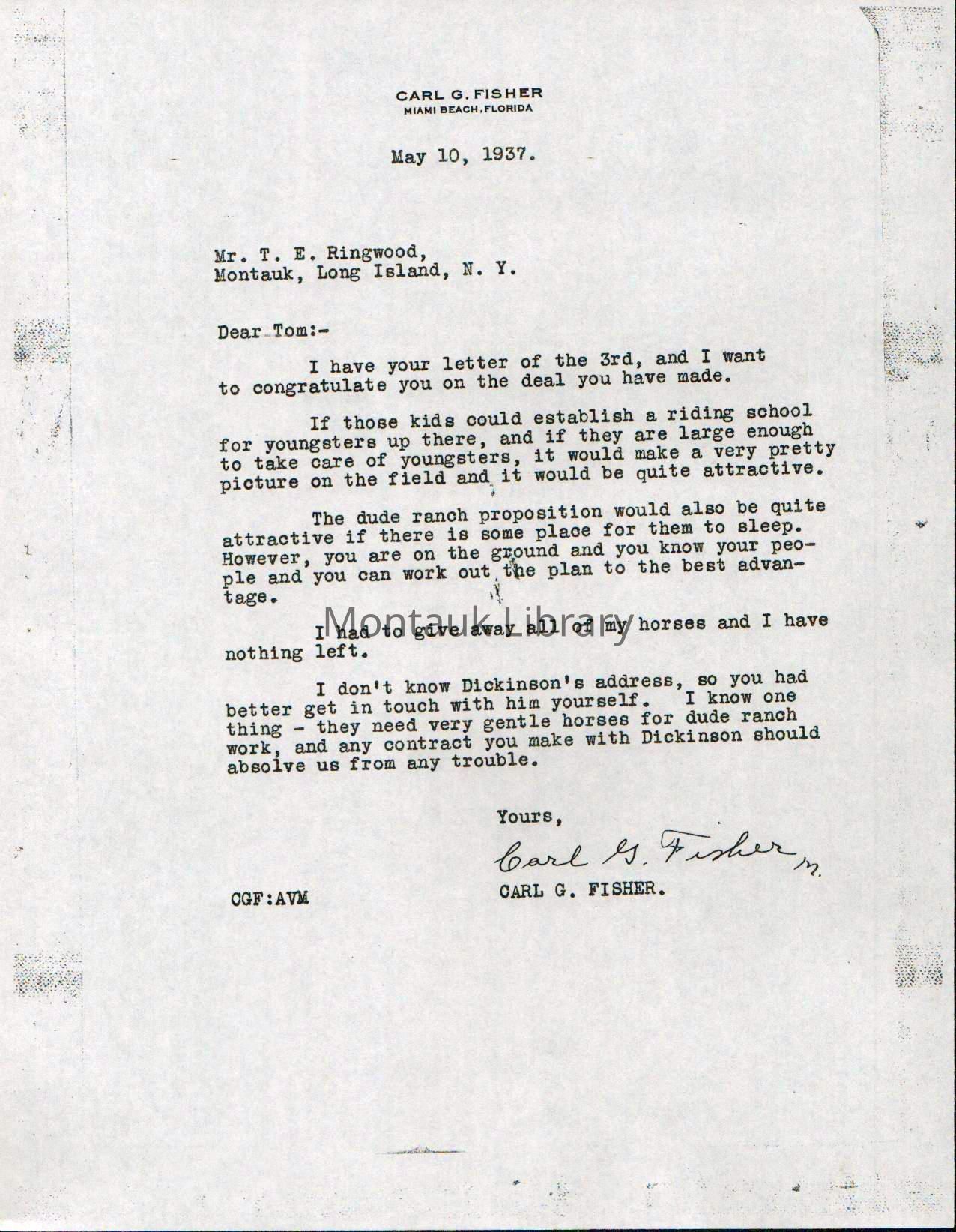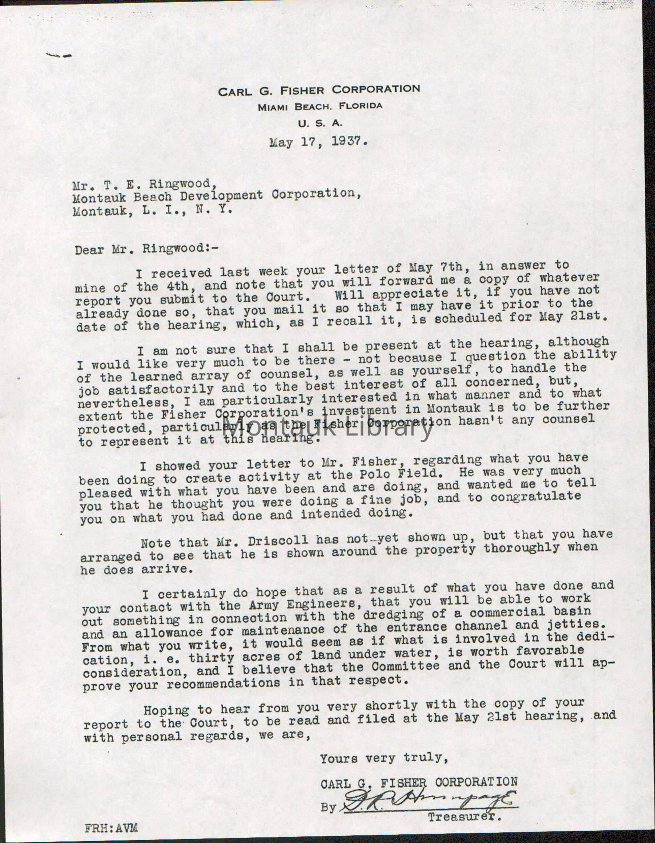 A collection of correspondence primarily from Carl G. Fisher and T. E. Ringwood relating to real estate development, personal matters, and the activities of the Montauk Beach Development Company and the Carl G. Fisher Corporation (Miami) from 1935 to 1939. Topics include real estate sales, Miami Beach building reports, Carl G. Fisher corporation finances, road conditions, summer cottages, potato planting, lumber and building supply quotes, speaker engagements, complaints about the unseasonably cold summer season, and dissatisfaction with development from the long withstanding Montauk residents. A majority of the collection consists of correspondence between Carl G. Fisher and T. E. Ringwood. Additional correspondents of note include Miss Elizabeth Agnew (owner of Weeweechu Tea House), Robert Moses, Richard T. Gilmartin, lieutenants and captains of the U.S. Marine Corps, and F. R. Humpage (Treasurer, Carl G. Fisher Corp in Miami).Archive Details