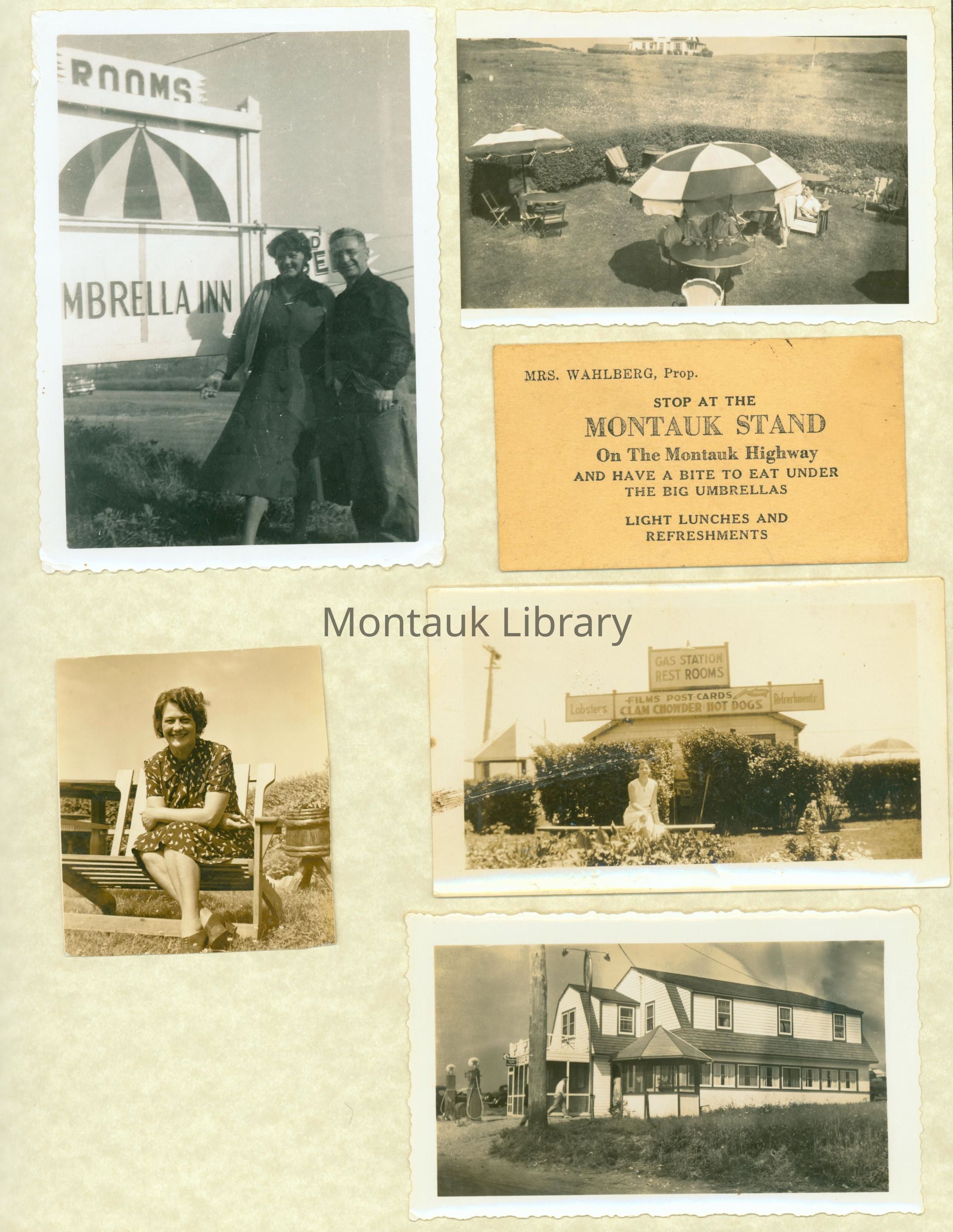A small collection consisting of photographs, newspaper clippings, business cards, real estate papers, and a cookbook from Carol Buckner documenting her grandmother's business, the Umbrella Inn. The Umbrella Inn was owned and operated by Camilla Wahlberg. The photographs capture life at the inn and restaurant during the 1940s and 1950s. Papers include a statement of registry for Umbrella Inn, a bill of sale, and a deposit for the land.Archive Details
