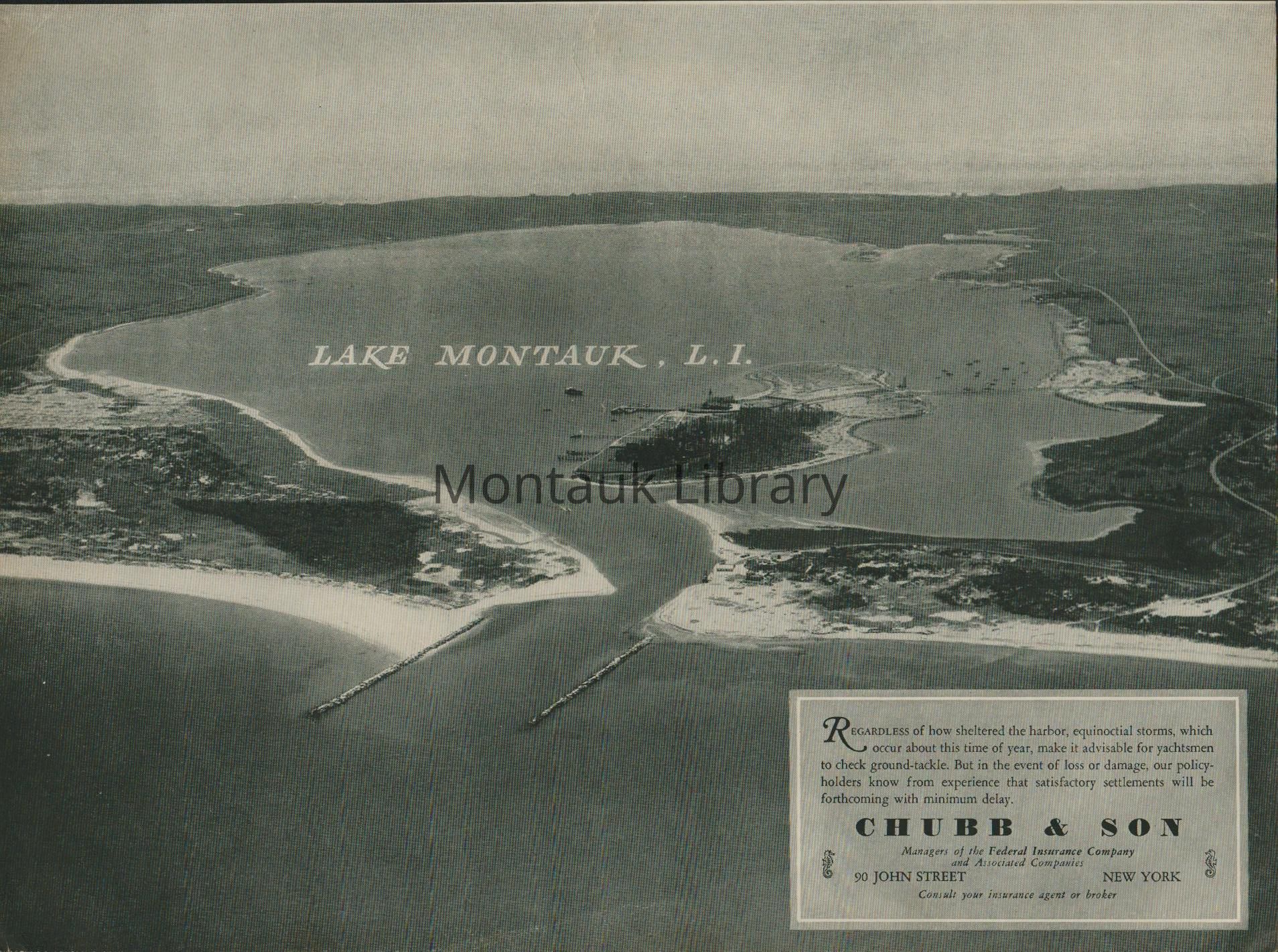 Advertisement for Chubb & Son managers of the Federal Insurance Company featuring an aerial photograph of Lake Montauk, including inlet, shoreline, harbor and Star Island.Dimensions