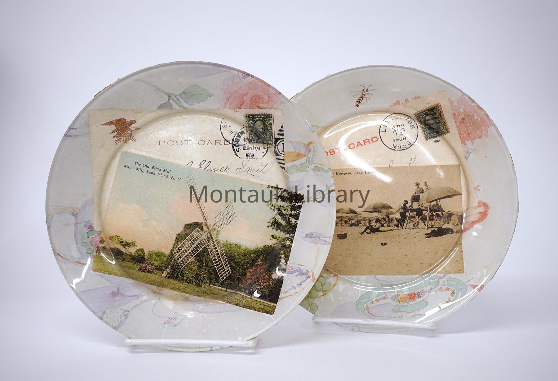 Set of 2 hand-made collaged plates using reproductions of postcards depicting the Old Wind Mill in Water Mill and a beach scene from East Hampton.Dimensions