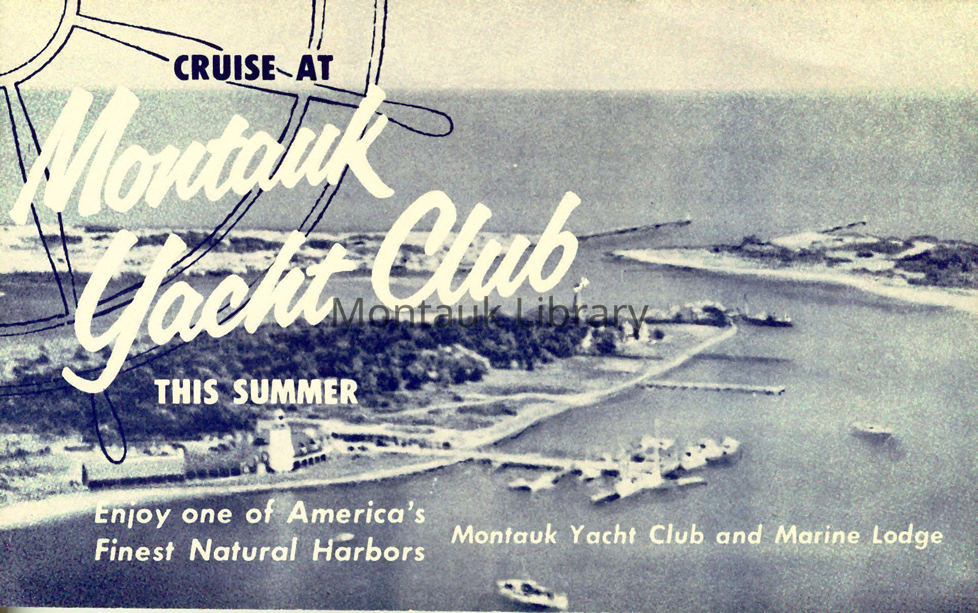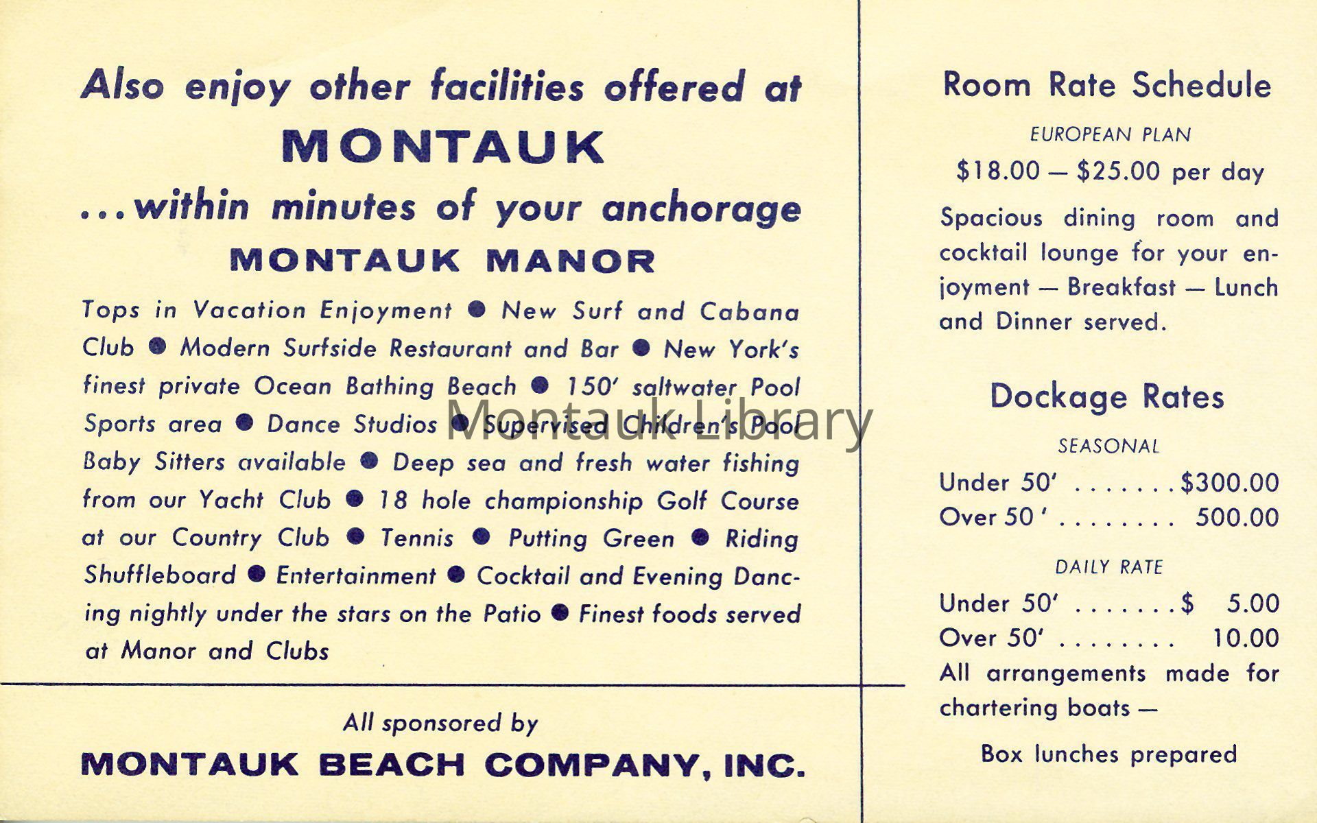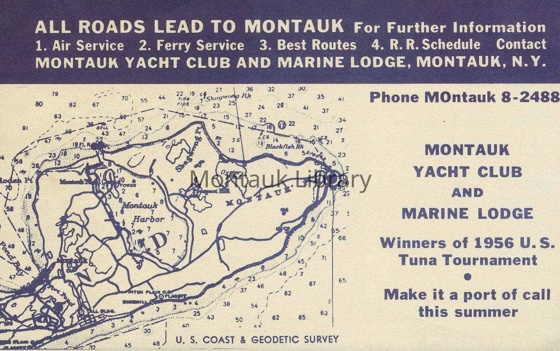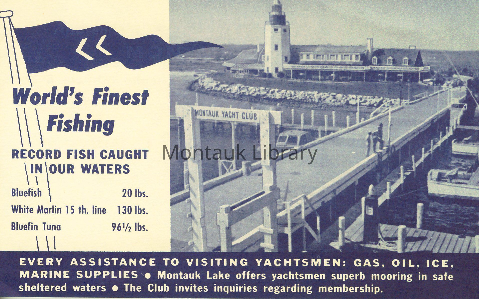 Bifold brochure from the Montauk Beach Company advertising the Montauk Yacht Club and Marine Lodge's services and amenities, including boarding, dockage, and fishing charters.Publication Details