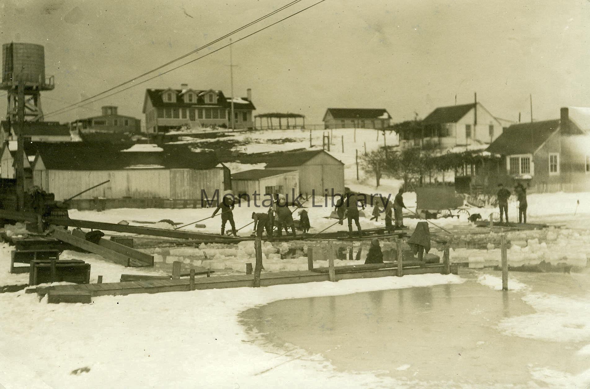 Photograph of men and children cutting blocks of ice from Tuthill Pond, Montauk, New York. Note with photograph reads: Large house on hill was home of Benjamin Tuthill, son of Capt. Edwin Tuthill. Horses were hired from Emil Gardell with special cork shoes so they could walk on ice. A horse would plow with a series of blades across the ice and lay out a grid, cutting the ice about halfway through.Dimensions