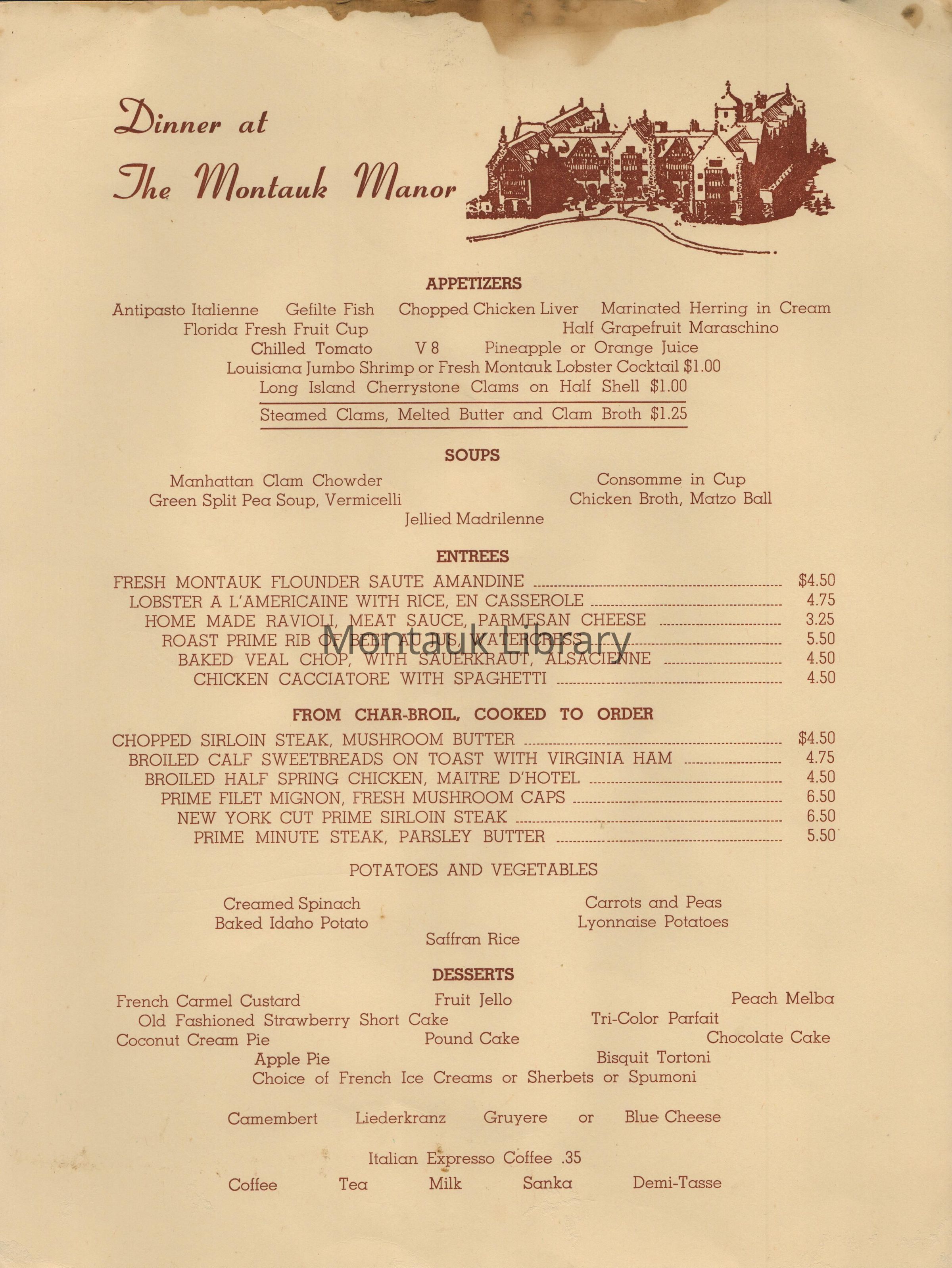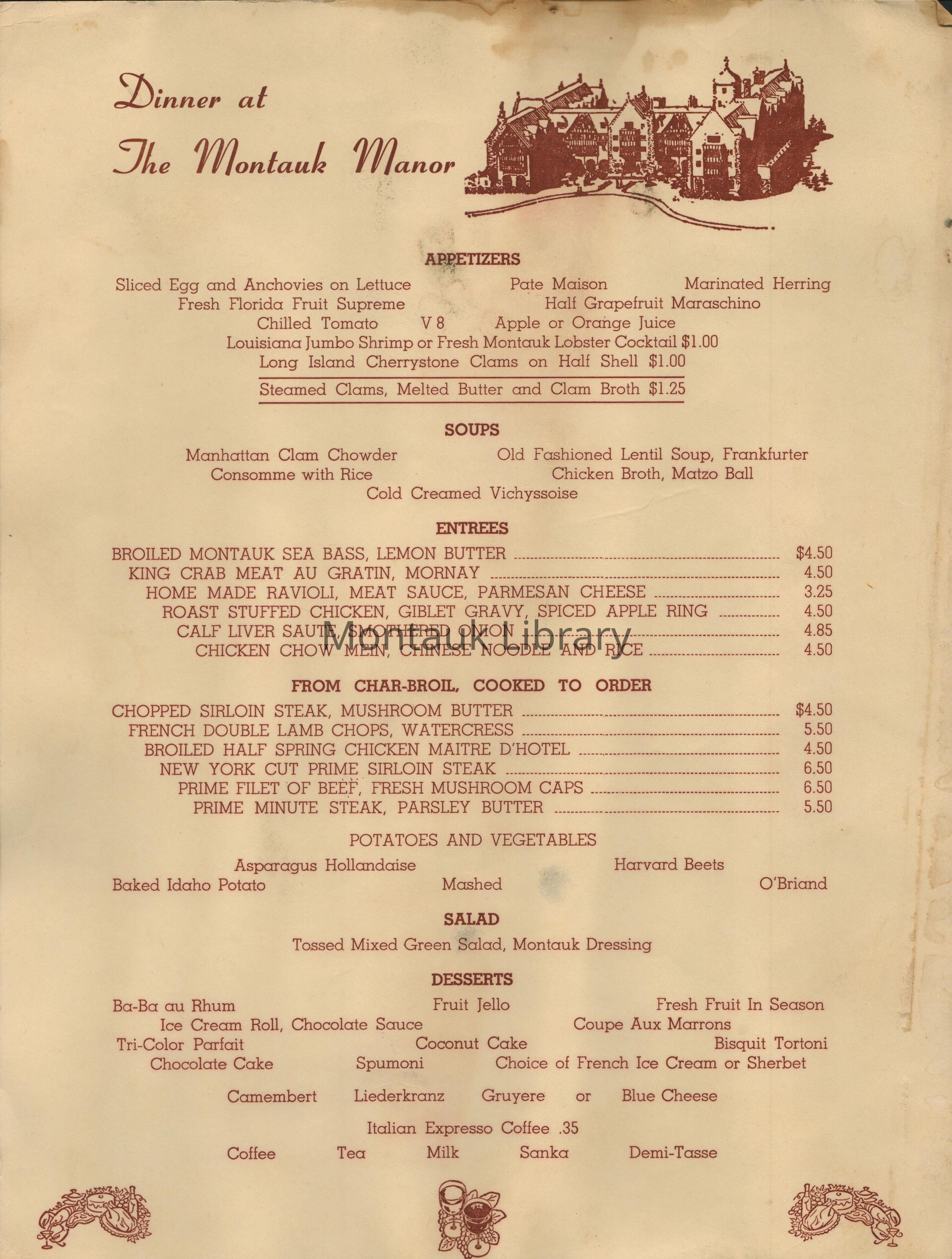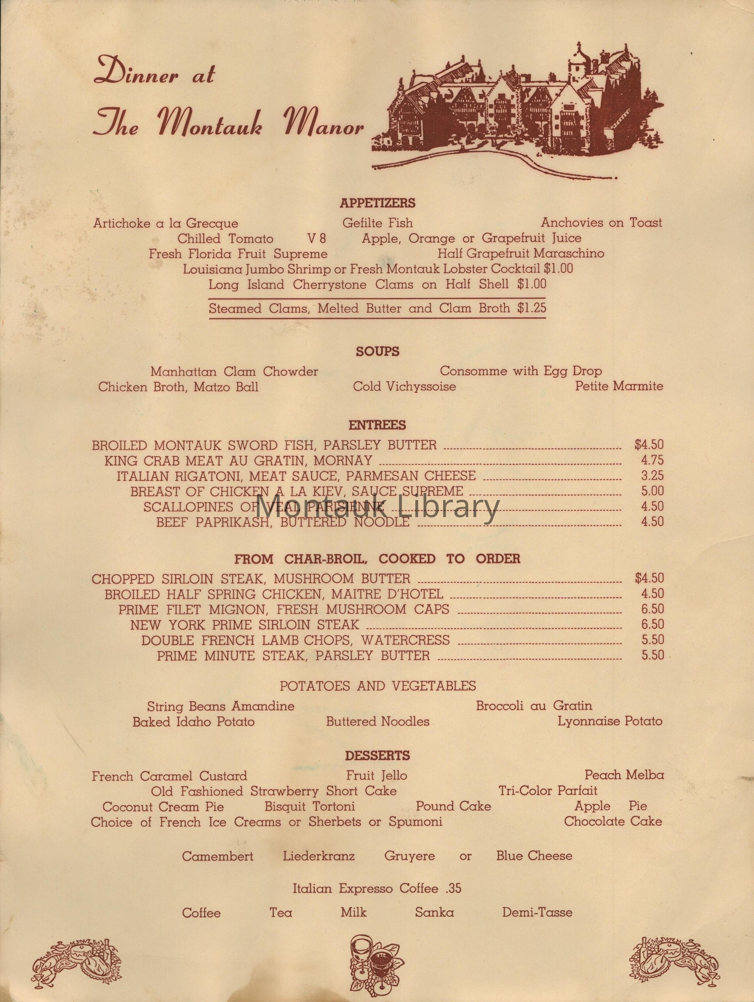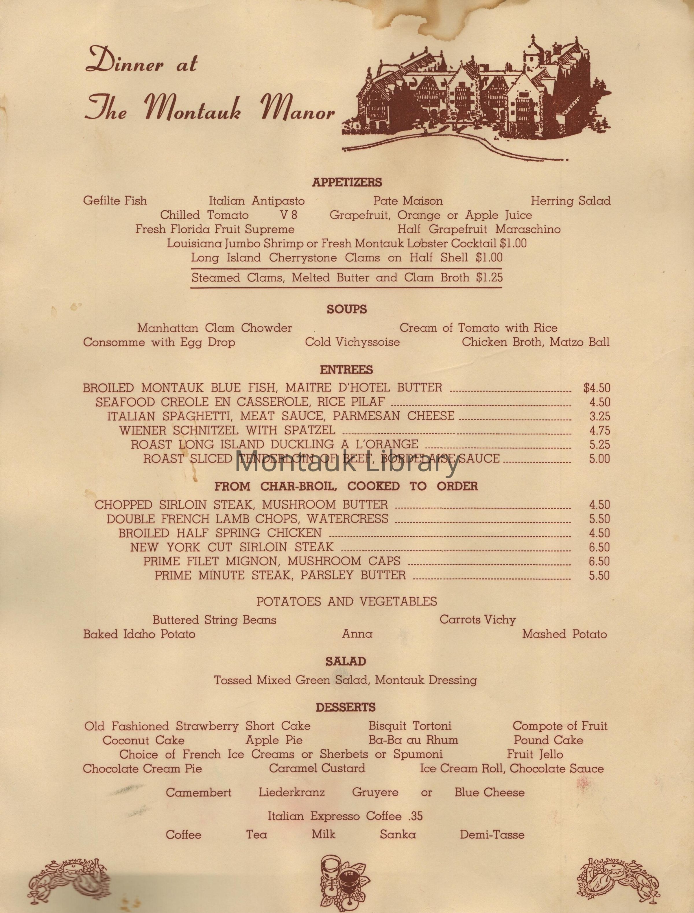 Dinner at The Montauk Manor Menu CollectionEntry/Object ID