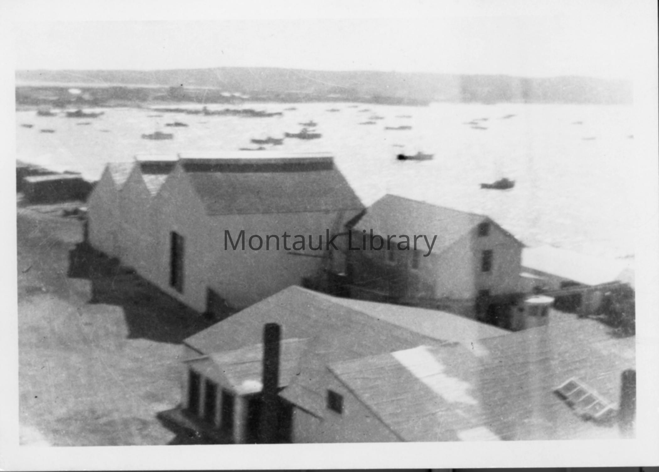 Reproduction of a photographer from the 1920s-1930s showing Duryea's Ice House on Fort Pond Bay, Jake Well's dock in near distance, and the railroad dock in the far distance.Photograph Details
