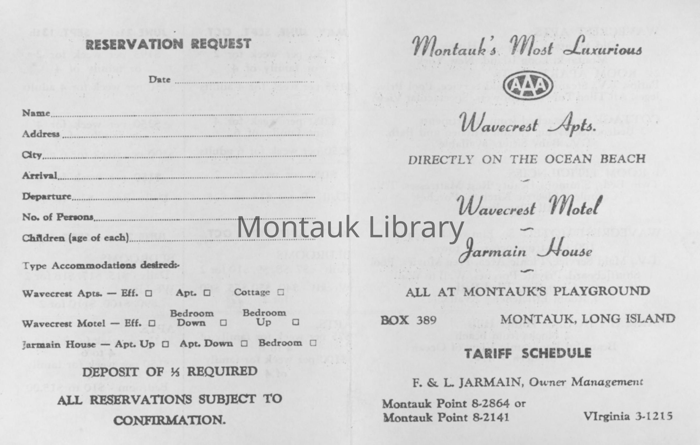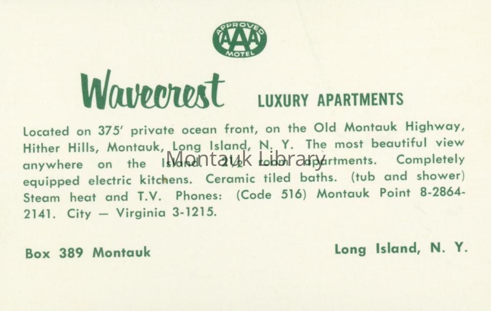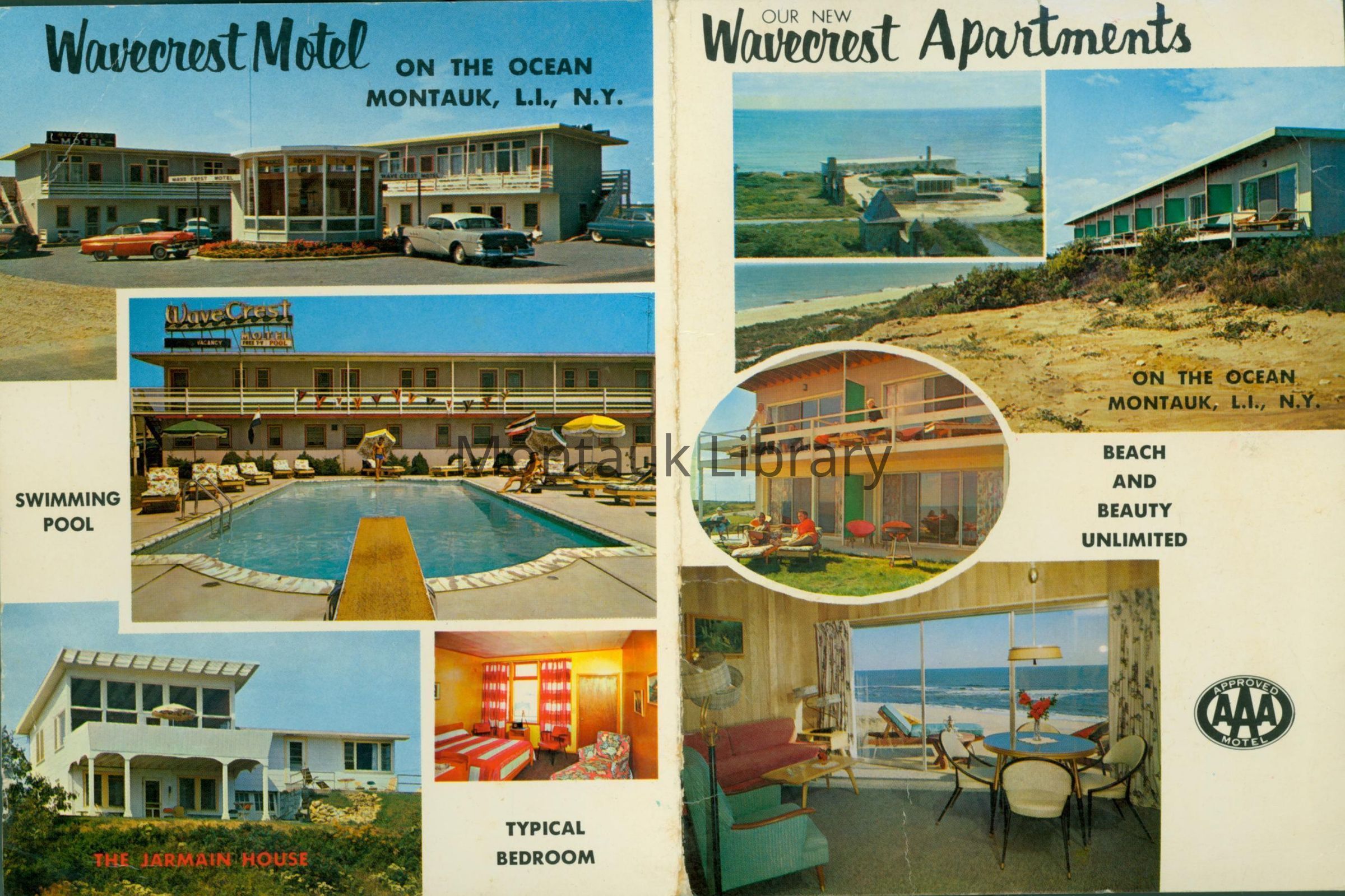 A small collection of printed ephemera from Wavecrest Motel and Apartments in Montauk, NY. Includes a business card, letter, brochure, and reservation request.Archive Details