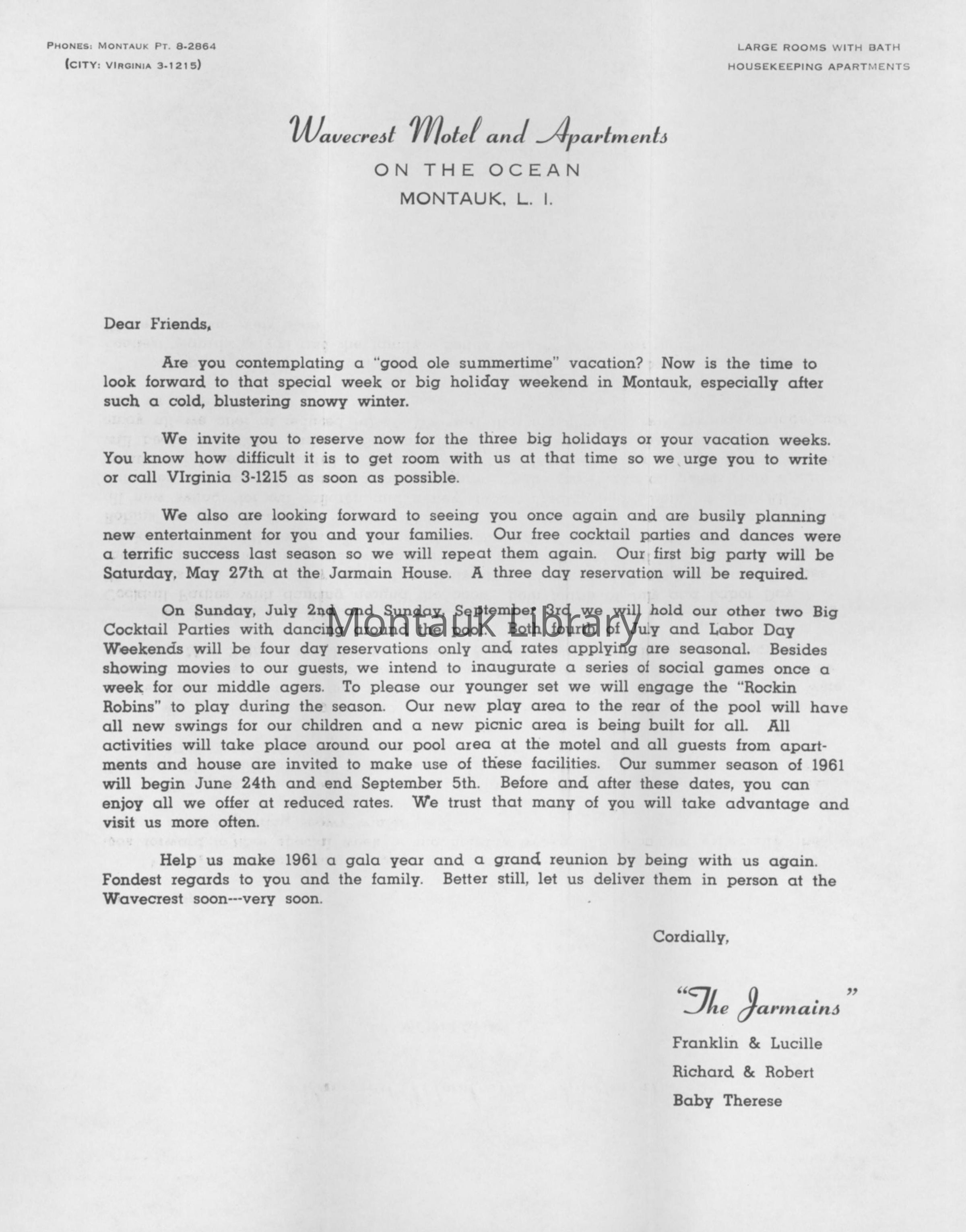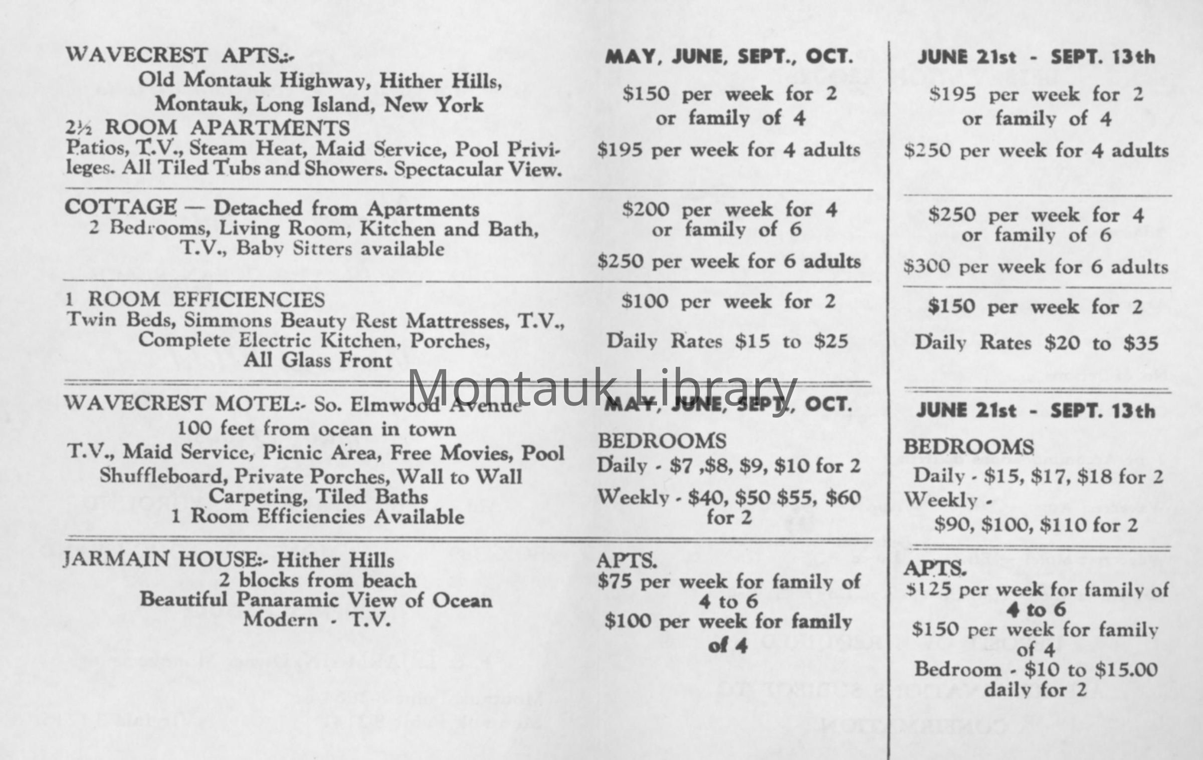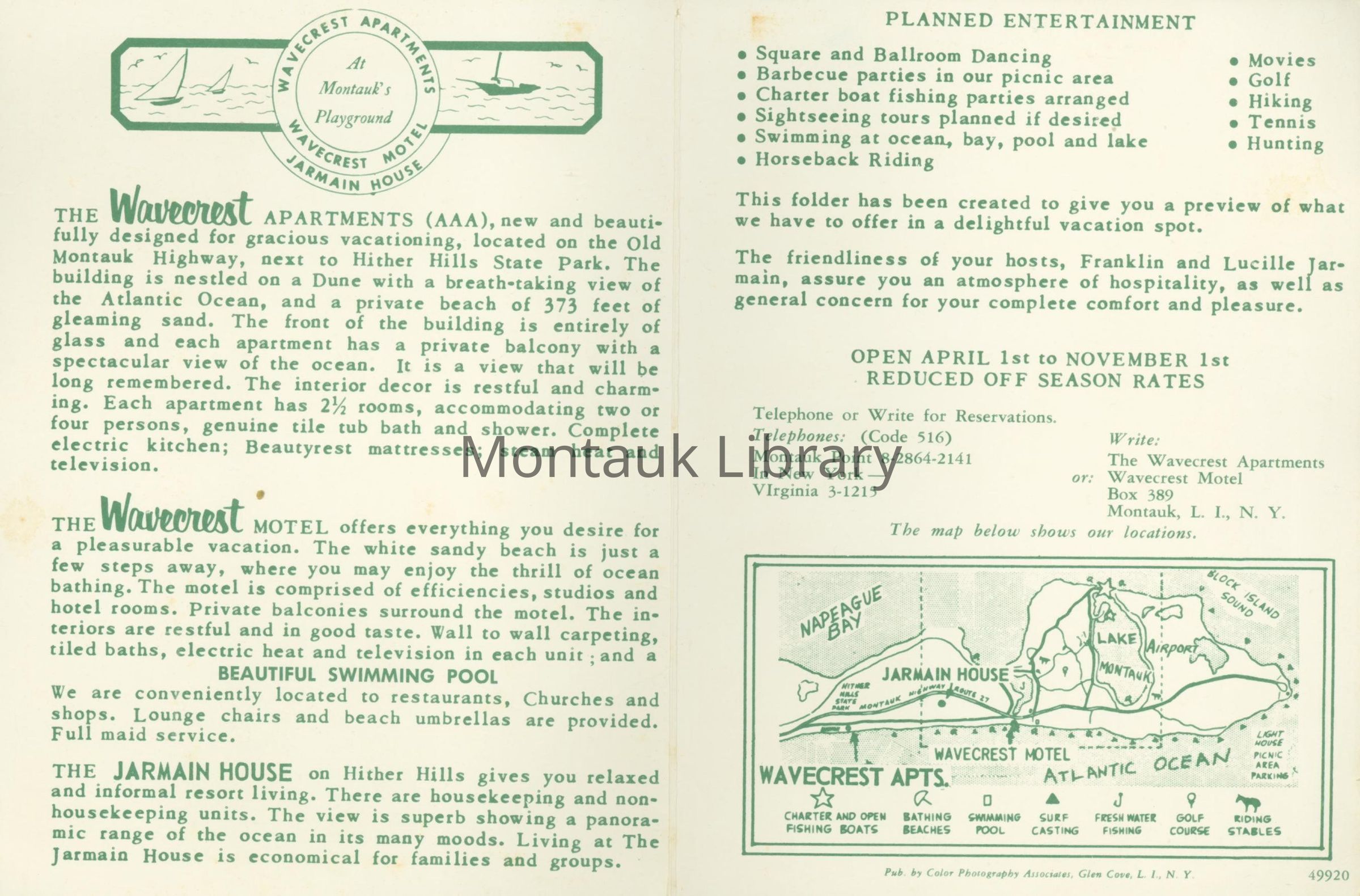 A small collection of printed ephemera from Wavecrest Motel and Apartments in Montauk, NY. Includes a business card, letter, brochure, and reservation request.Archive Details