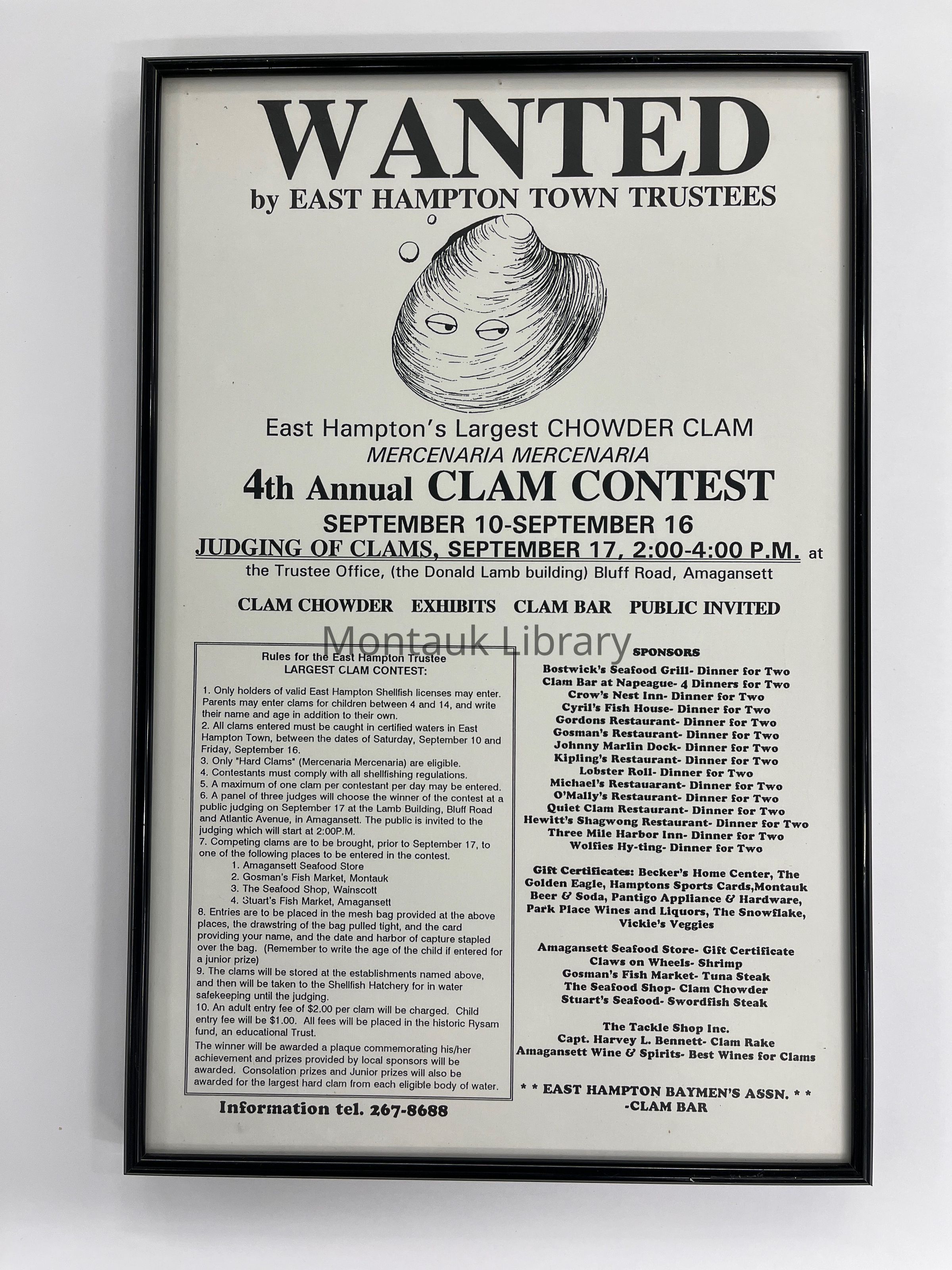 Poster advertising the East Hampton Town Trustees 4th Annual Clam Contest in 1994. Includes rules for the largest clam contest, sponsors, and event details.Acquisition