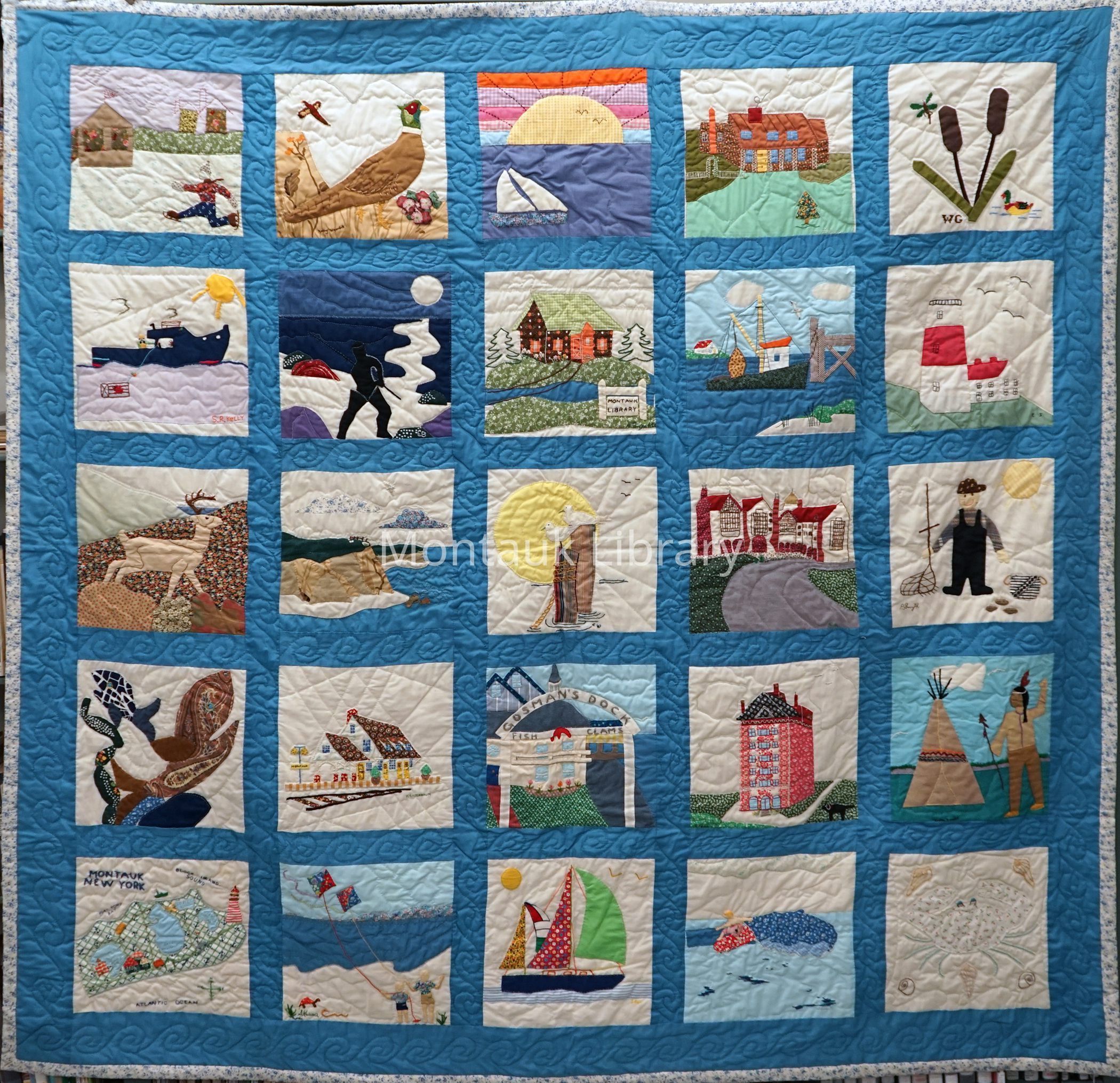 A quilt made by the Friends of the Montauk Library as a fundraiser for the Montauk Library. The quilt was raffled off in 1981. The winner donated the quilt back to the library some years later. Includes hand-sewn and machine-stitched scenes of different places and landmarks of Montauk.Dimensions