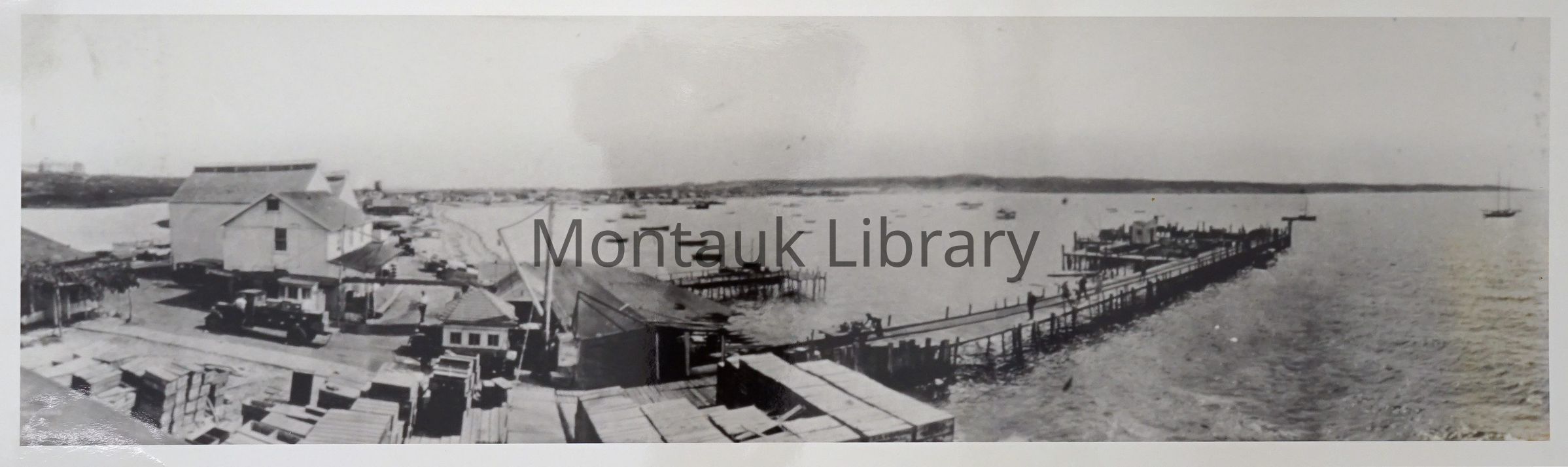 Black-and-white photographic reproduction of a photo from 1930s depicting Fort Pond Bay with Tuthill's dock in the foreground.Acquisition