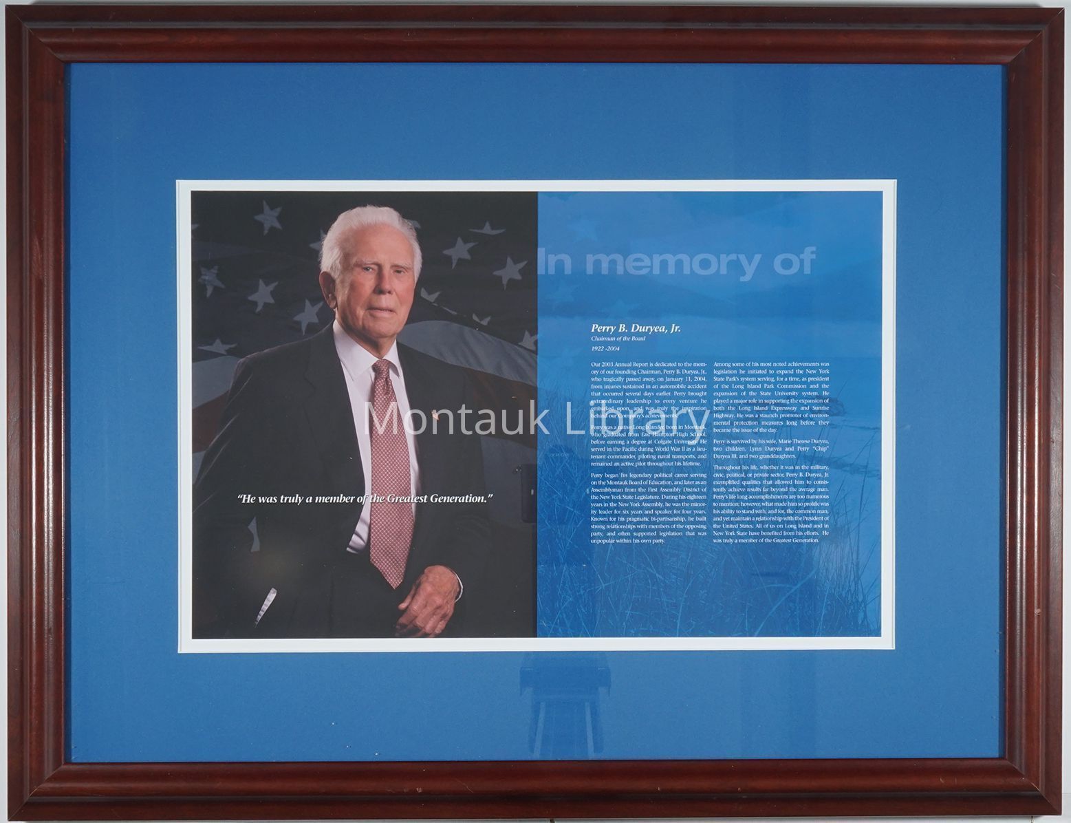 Framed print from an annual report with photograph and writing memorializing Perry B. Duryea, Jr. (1922-2004).Dimensions