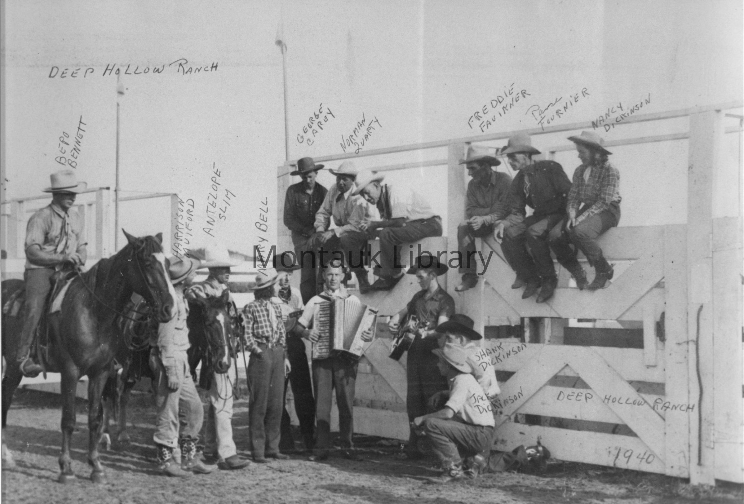 Small collection of 11 photographs, a brochure, and a postcard from Deep Hollow Ranch in 1939 and 1940. Photographs depict ranch staff, cowboys, horses, horse and cattle shows.Archive Details