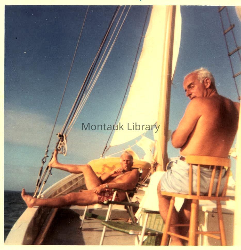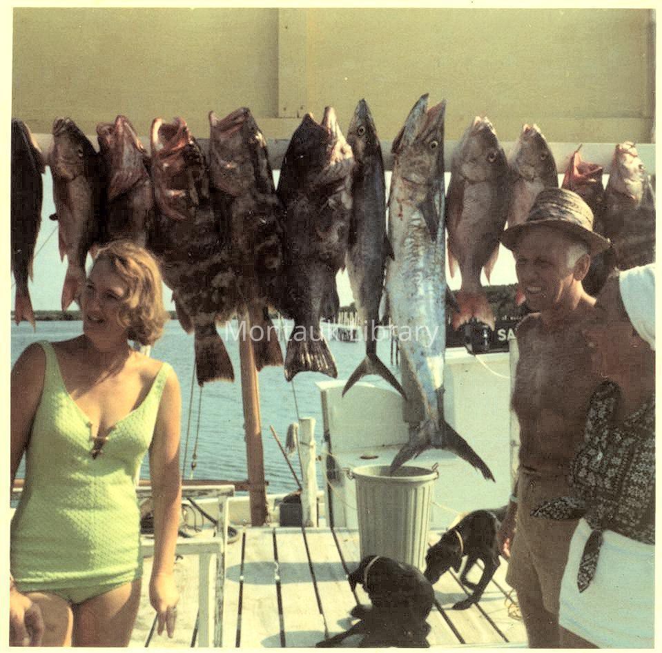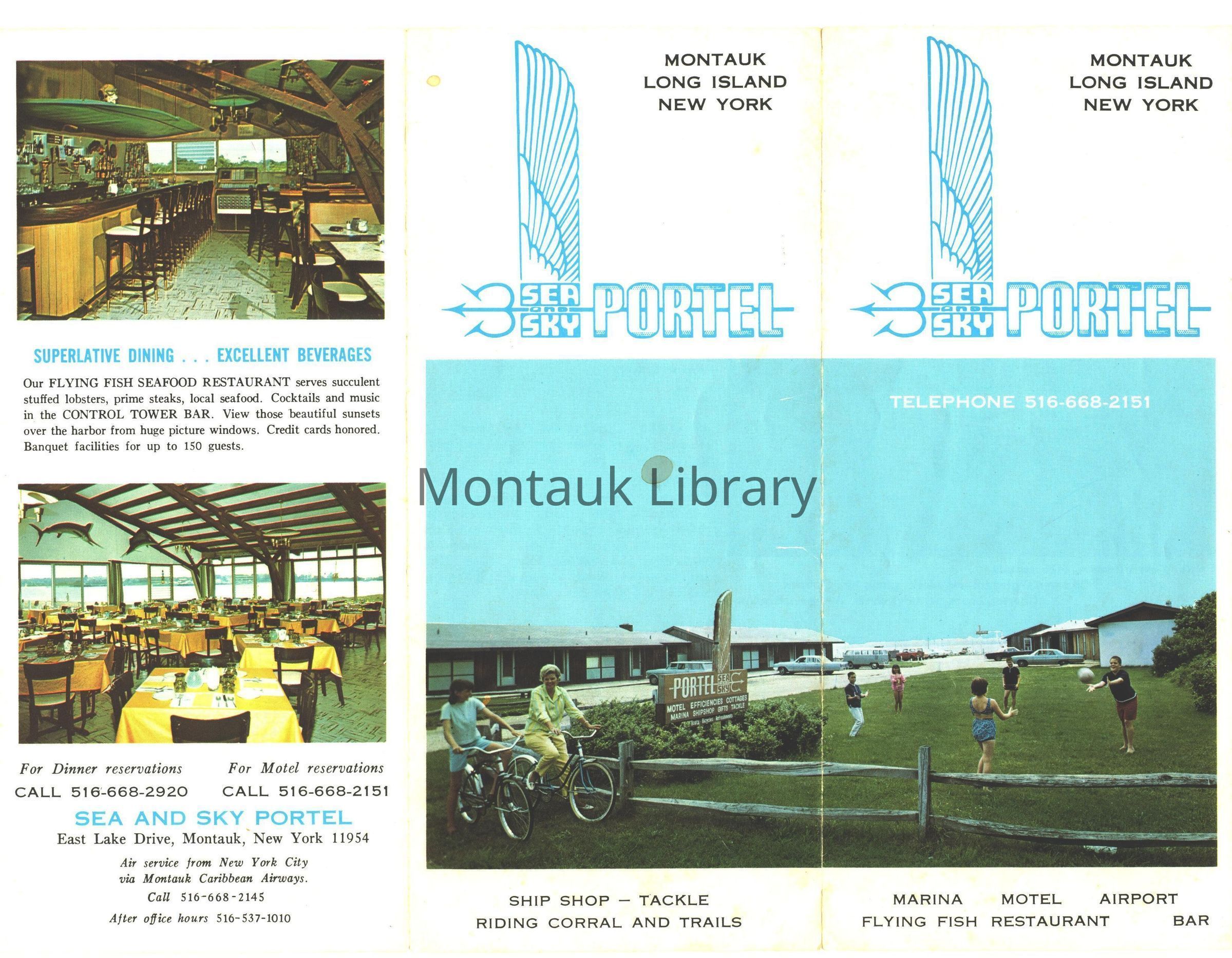 A small collection of three items from Kate Mund Loschen. Includes a 1969 brochure from the Sea and Sky Portel on East Lake Drive in Montauk, and two photographs circa 1970. The first of Alice Mund, Perry and Bettie Duryea in front of their catch, and a second photograph of Perry Duryea and Henry Mund aboard a sailboat.Archive Details
