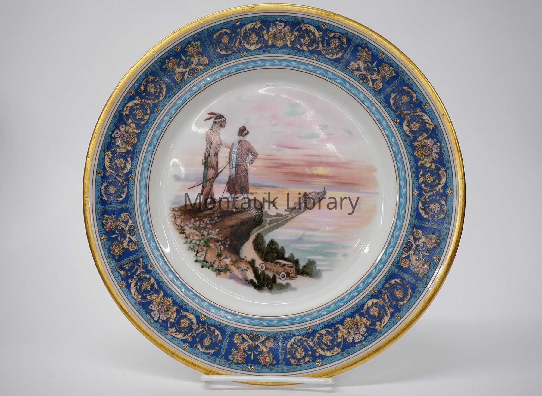 Pictorial plate depicting a woman and a Native American man overlooking Montauk from a cliff with a sunrise rising behind the Montauk Point Lighthouse