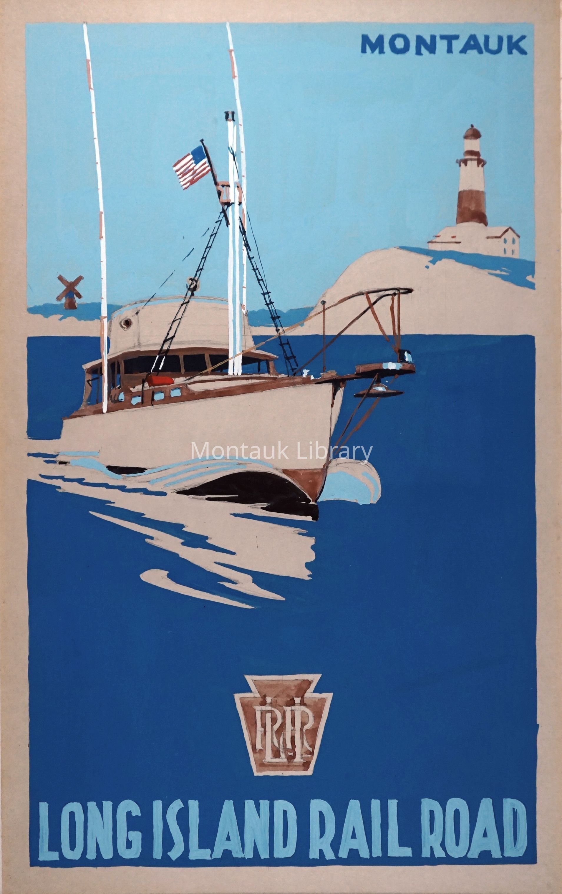 Gouache maquette for poster by Edward P. Chrystie advertising the Long Island Railroad line to Montauk—picturing a fishing vessel, windmill, and the Montauk Point lighthouse.Artwork Details