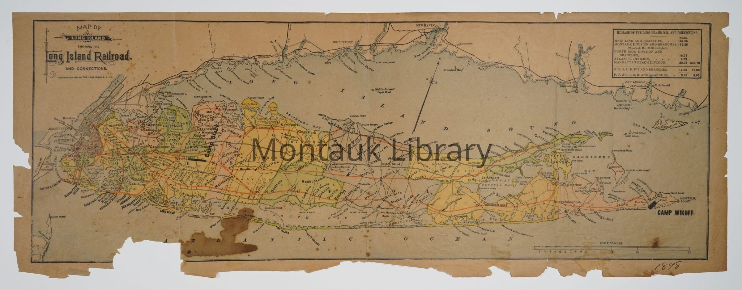 Map of Long Island showing the Long Island Railroad and connections, produced by the Long Island Rail Road Company in 1894. The map shows Long Island from the Hudson River, including Manhattan, Brooklyn, Queens, Nassau, and Suffolk Counties. Includes old rail lines including the Sag Harbor extension, station names, town names, and military stations Camp Black and Camp Wikoff.Map Details