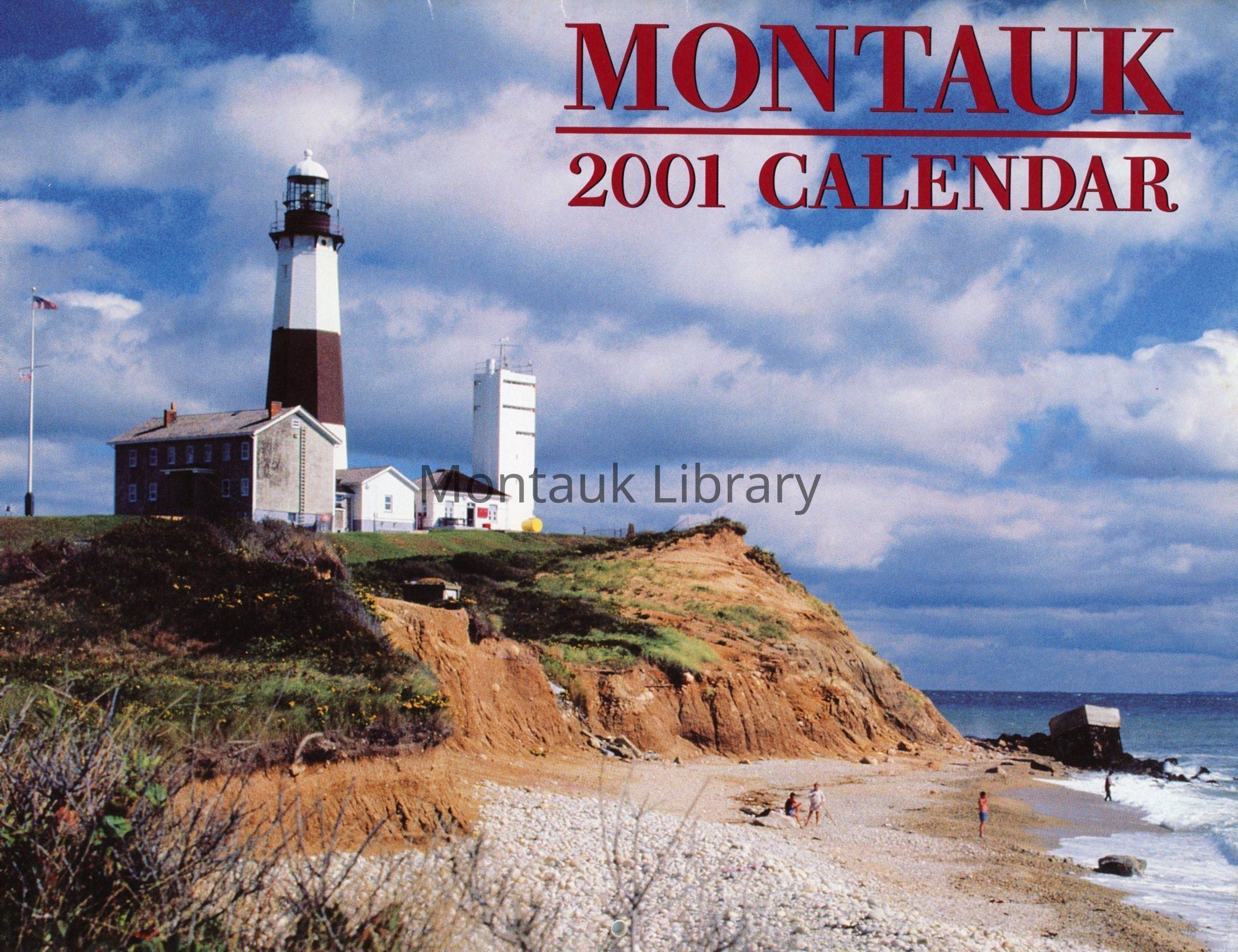 Montauk 2001 Calendar produced by Nyemac Inc. Montauk, NY. Photographs by John Keeshan depicting the lighthouse, surfcasters, plaza in winter, train station, inlet, dunes, plaza in summer, beaches, Montauk harbor, and downtown.Publication Details