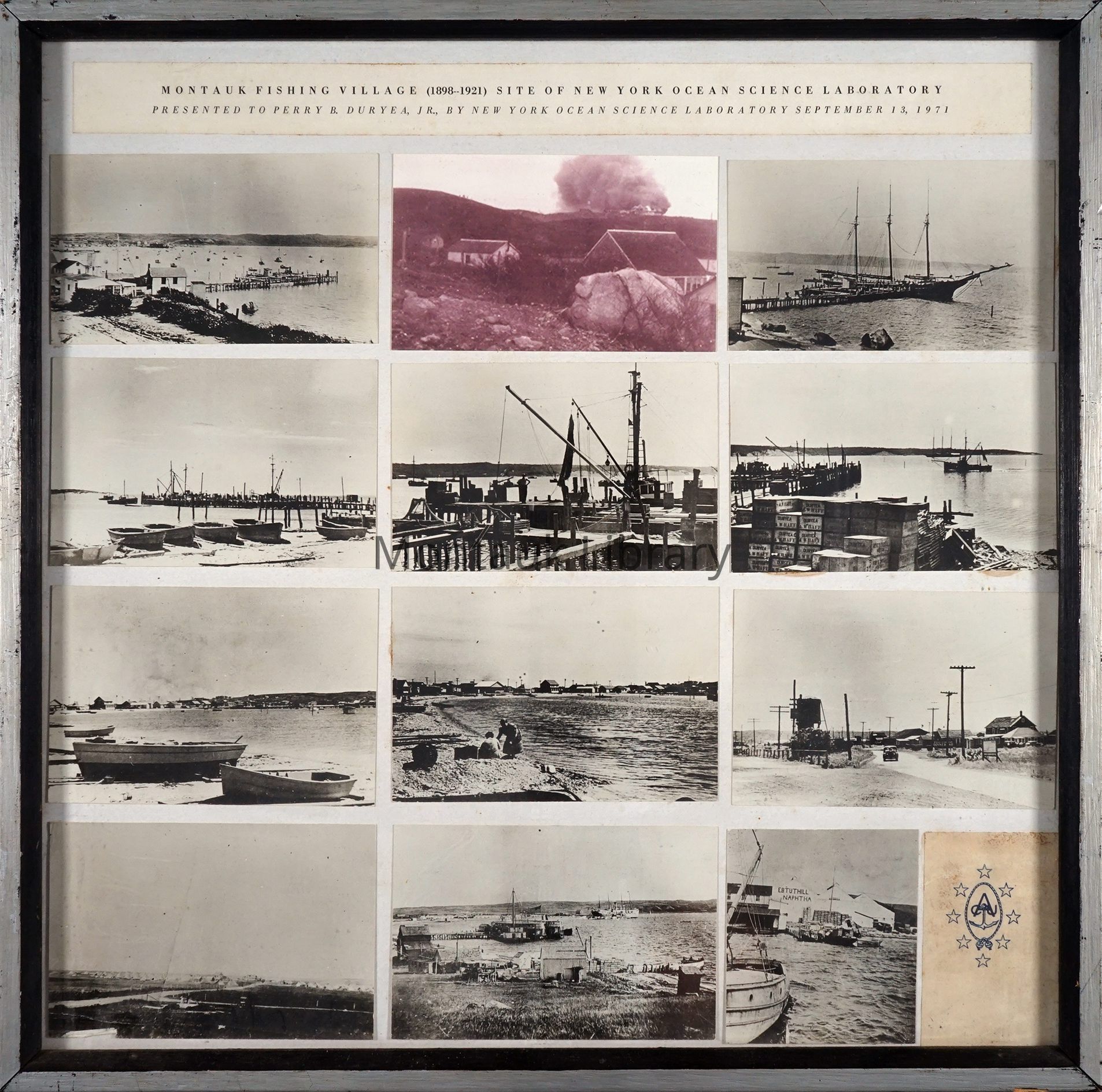 Montauk Fishing Village (1898-1921) site of the New York Ocean Science Laboratory. Presented to Perry B. Duryea, Jr. By the New York Ocean Science Laboratory September 13, 1971.Made/Created