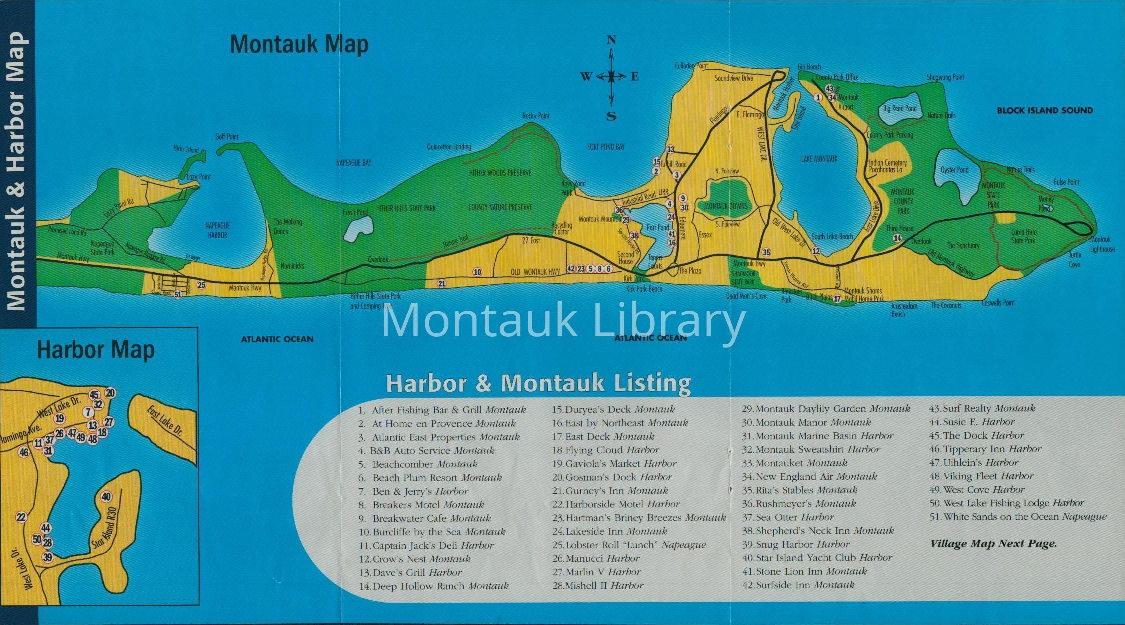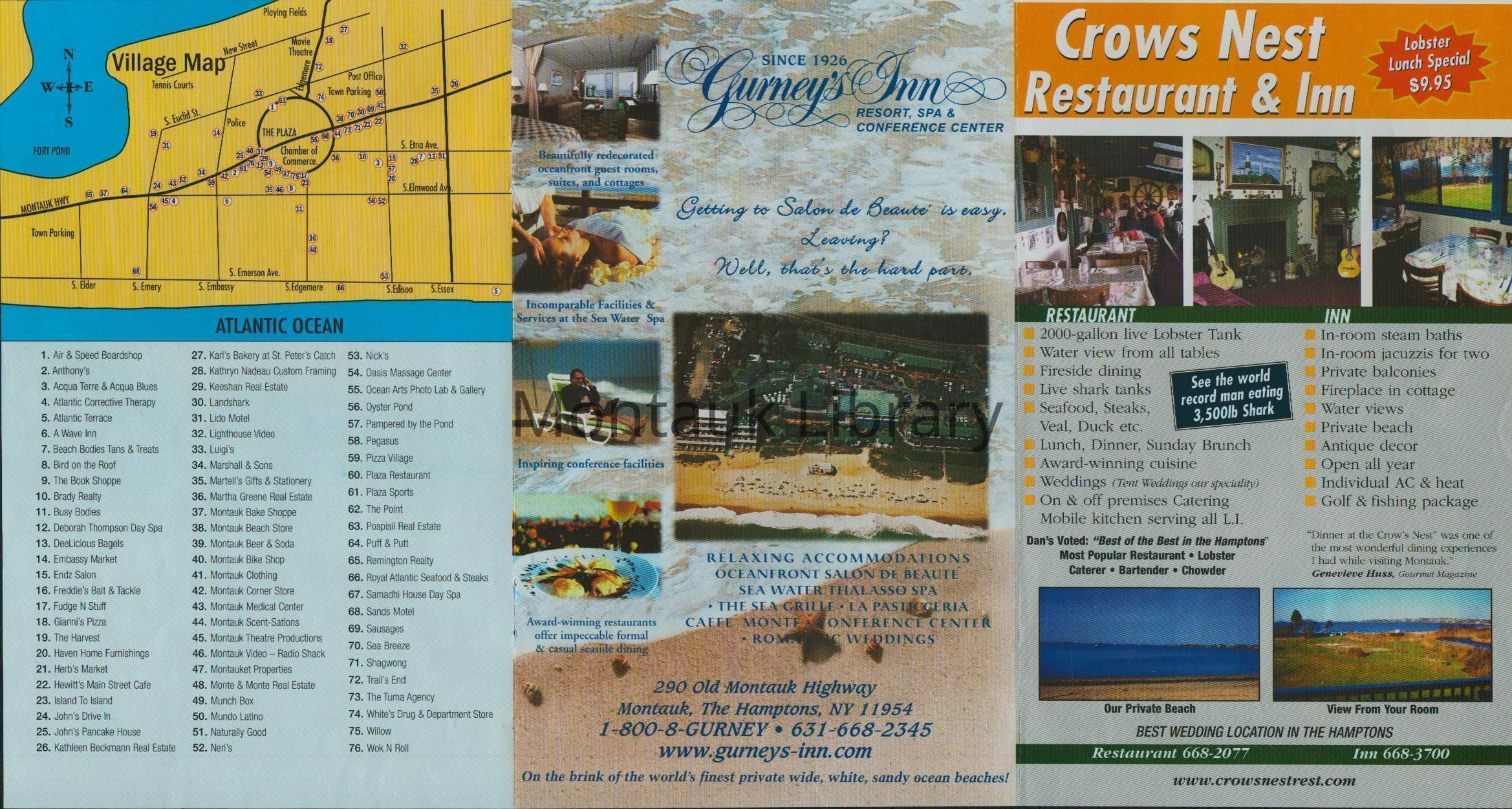 A trifold brochure featuring a map of Montauk includes listings for restaurants, services, motels, charter boats, recreational sites. Advertisements for Gurney's Inn and Crows Nest Restaurant and Inn on verso.Publication Details