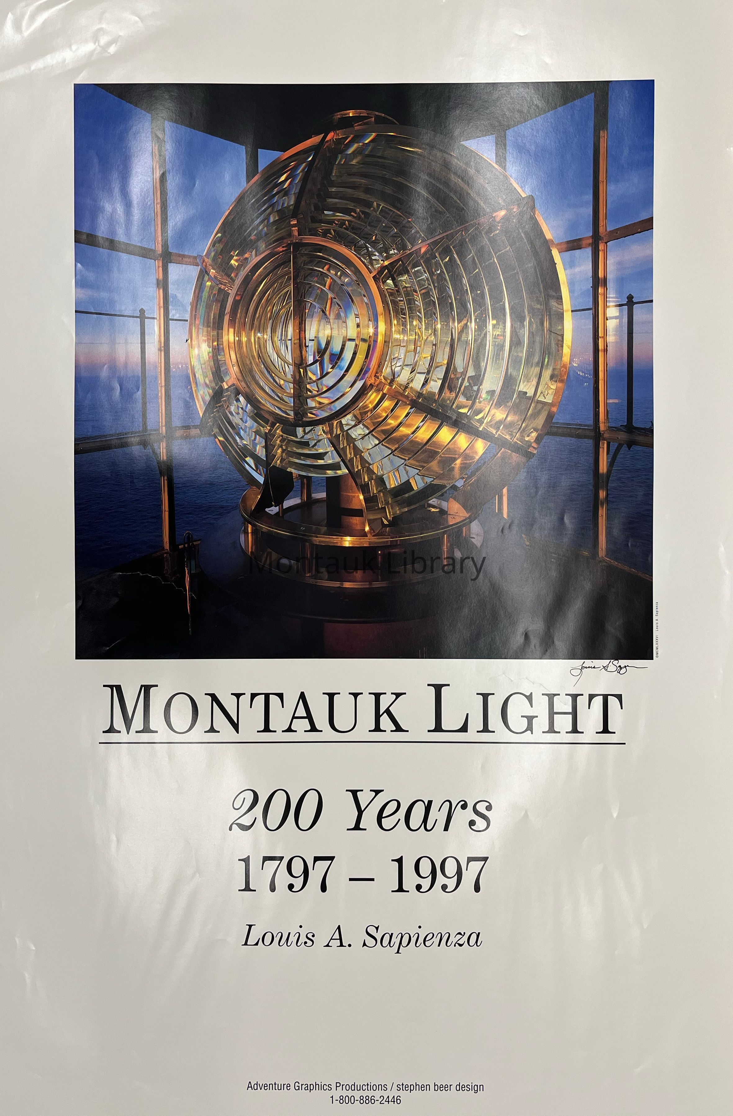 Large poster with photograph by Louis A. Sapienza depicting the Fresnel lens at the Montauk Point Lighthouse.Inscription/Signature/Marks