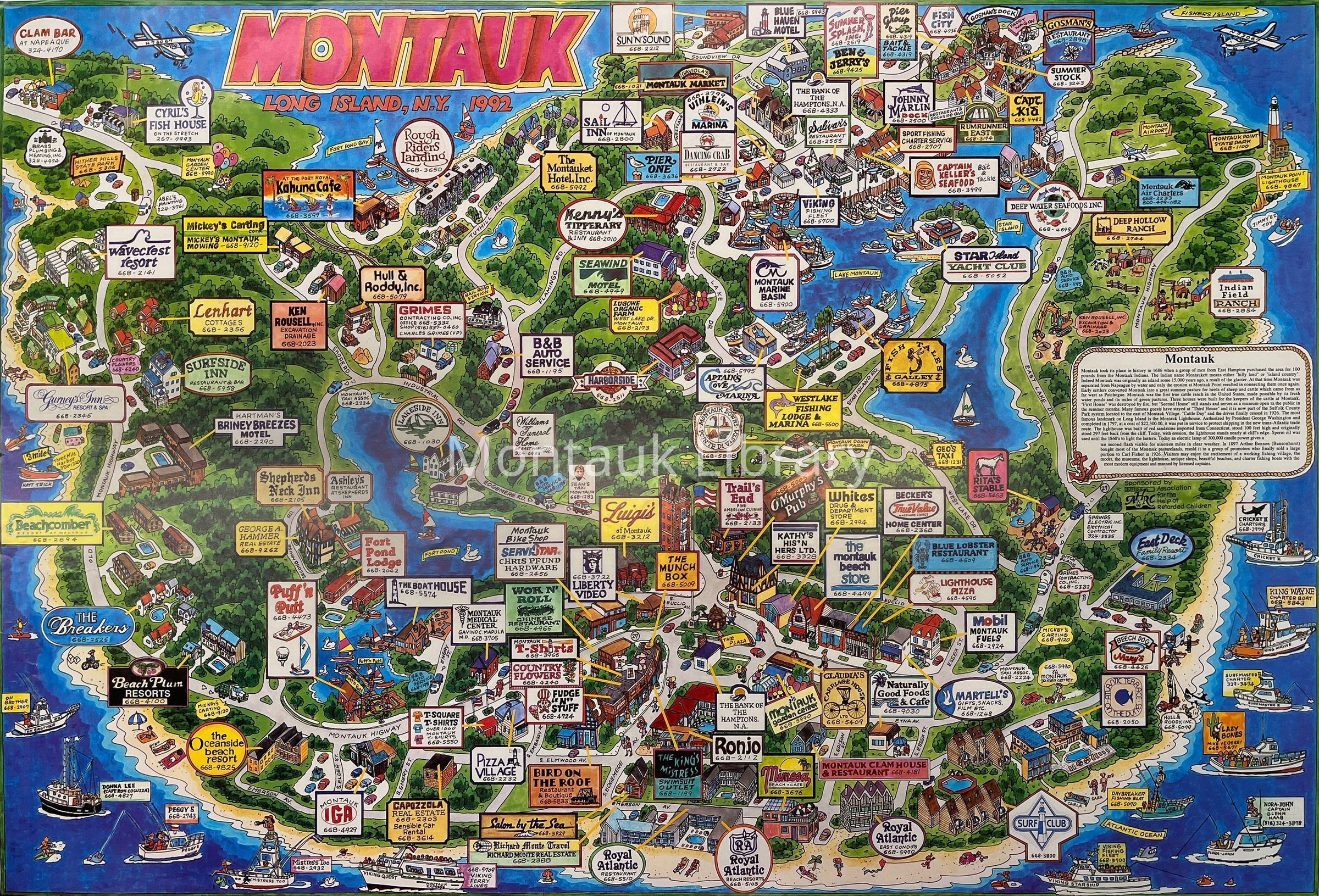 Illustrated map of Montauk showing commercial establishments (restaurants, hotels, beach clubs, resorts, retail stores) and historic points of interest.Map Details