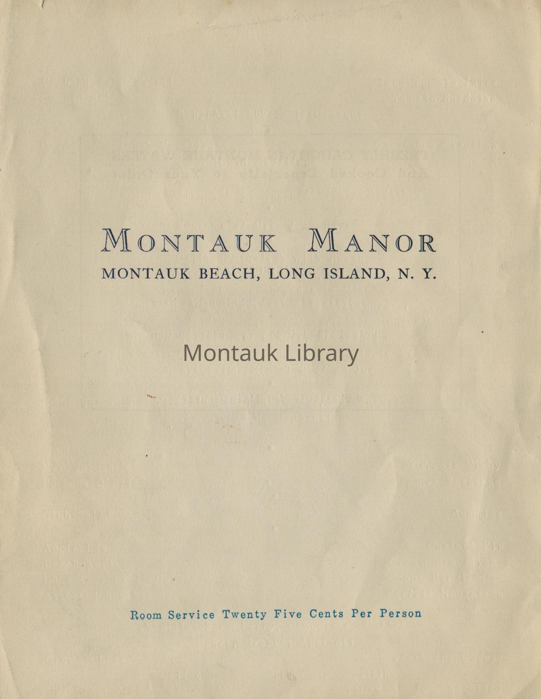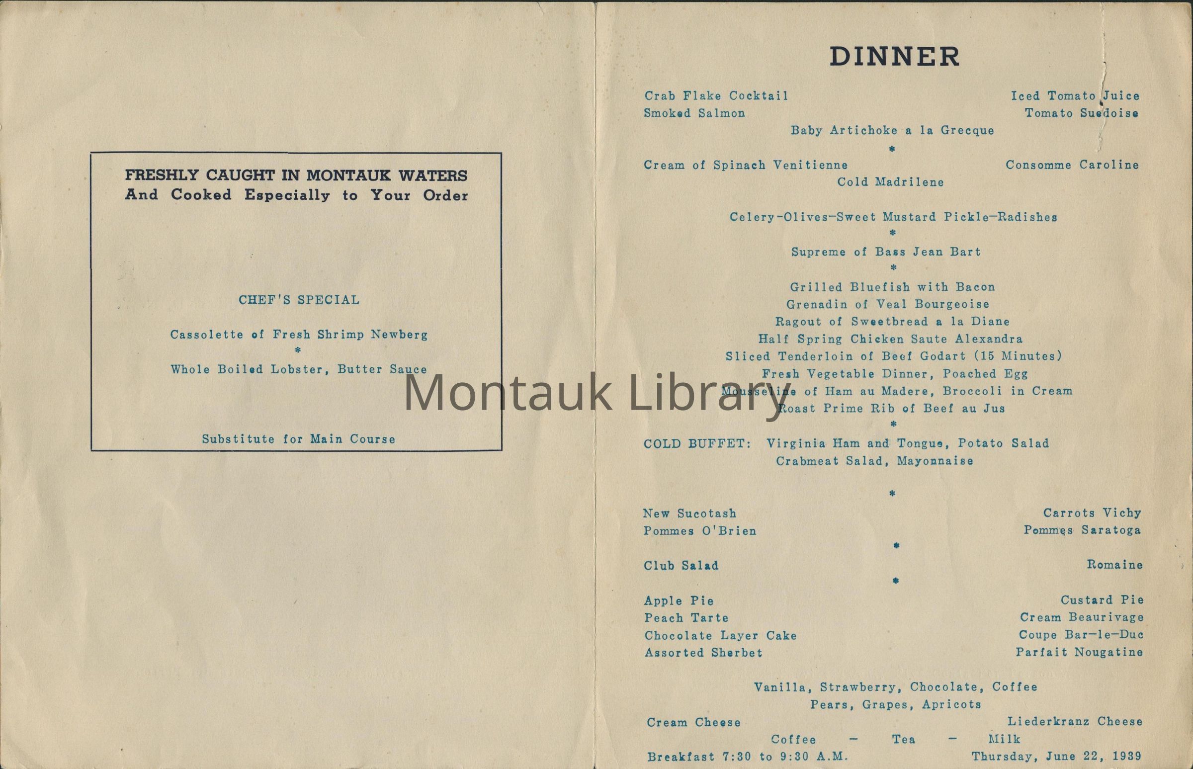 Dinner menu for the Montauk Manor on Thursday, June 22, 1939. Fish freshly caught in Montauk and cooked to order.Copyright