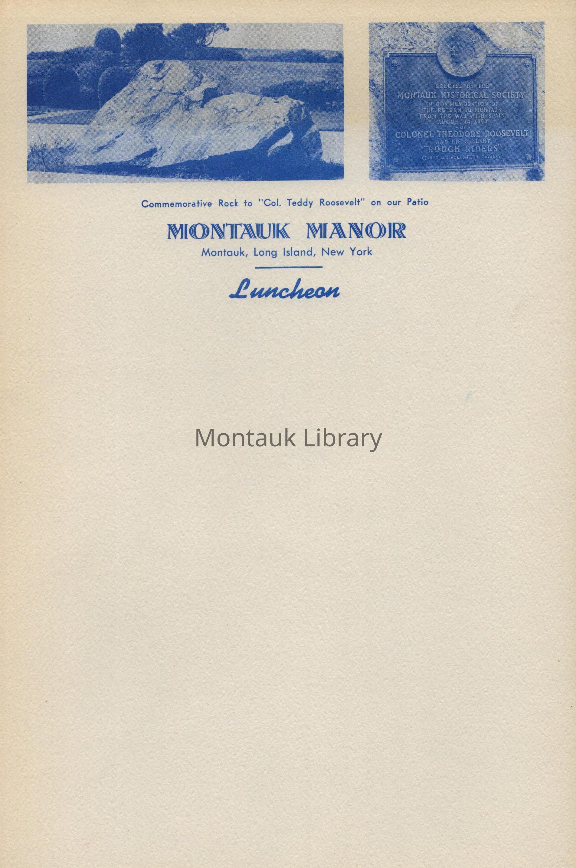 Blank stationary from the Montauk Manor Luncheon, featuring images of the Col. Teddy Roosevelt commemorative rock on their patio. Blue ink on cardstock.Copyright