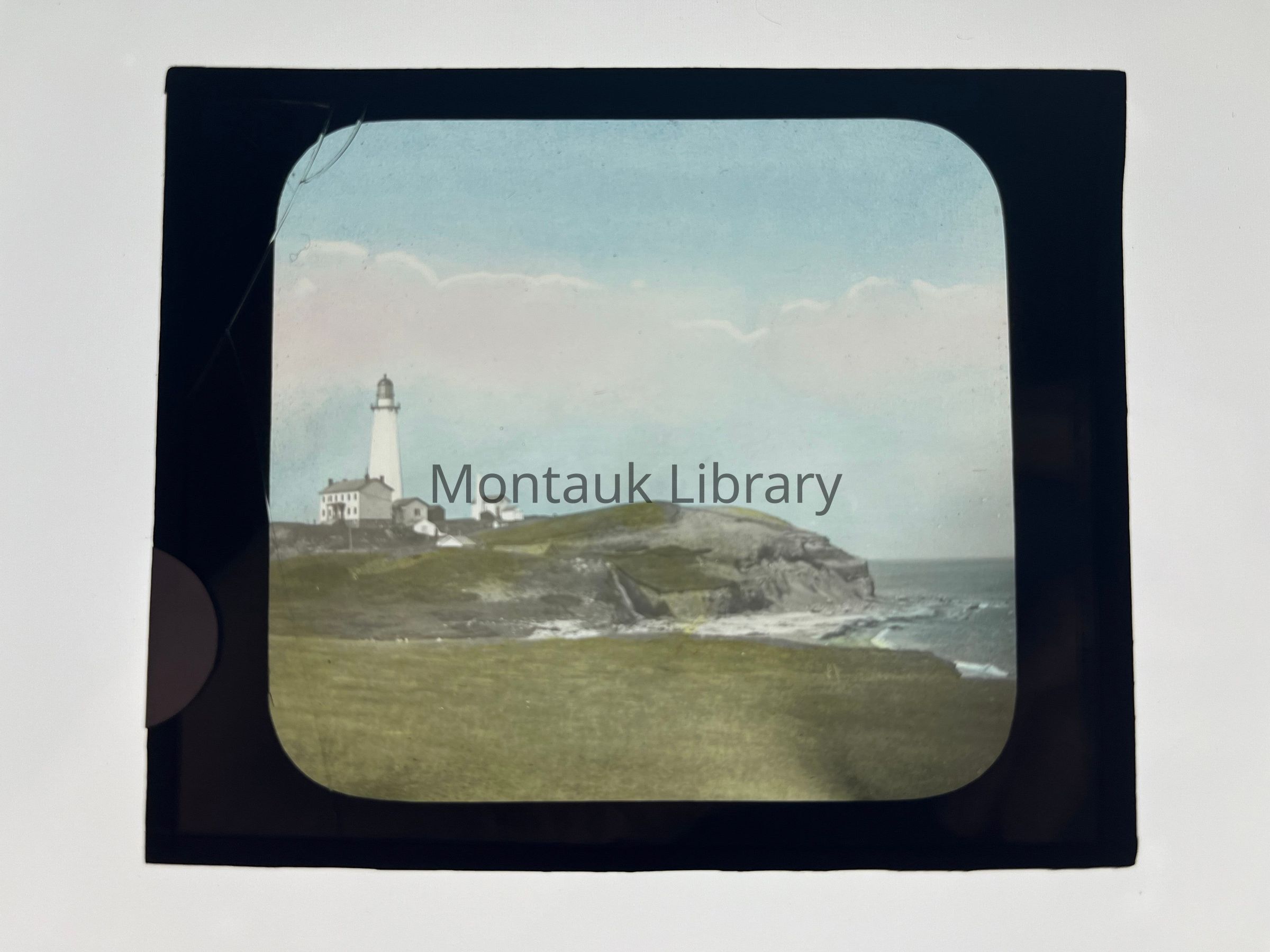 Hand-colored glass lantern slide depicting the Montauk Point Lighthouse, adjacent buildings, and bluff.