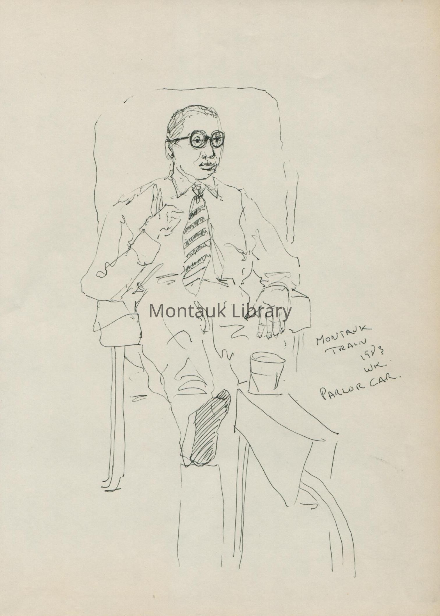 A drawing from an unknown artist of a man seated in the Montauk Train Parlor Car, 1983.Type of Drawing
