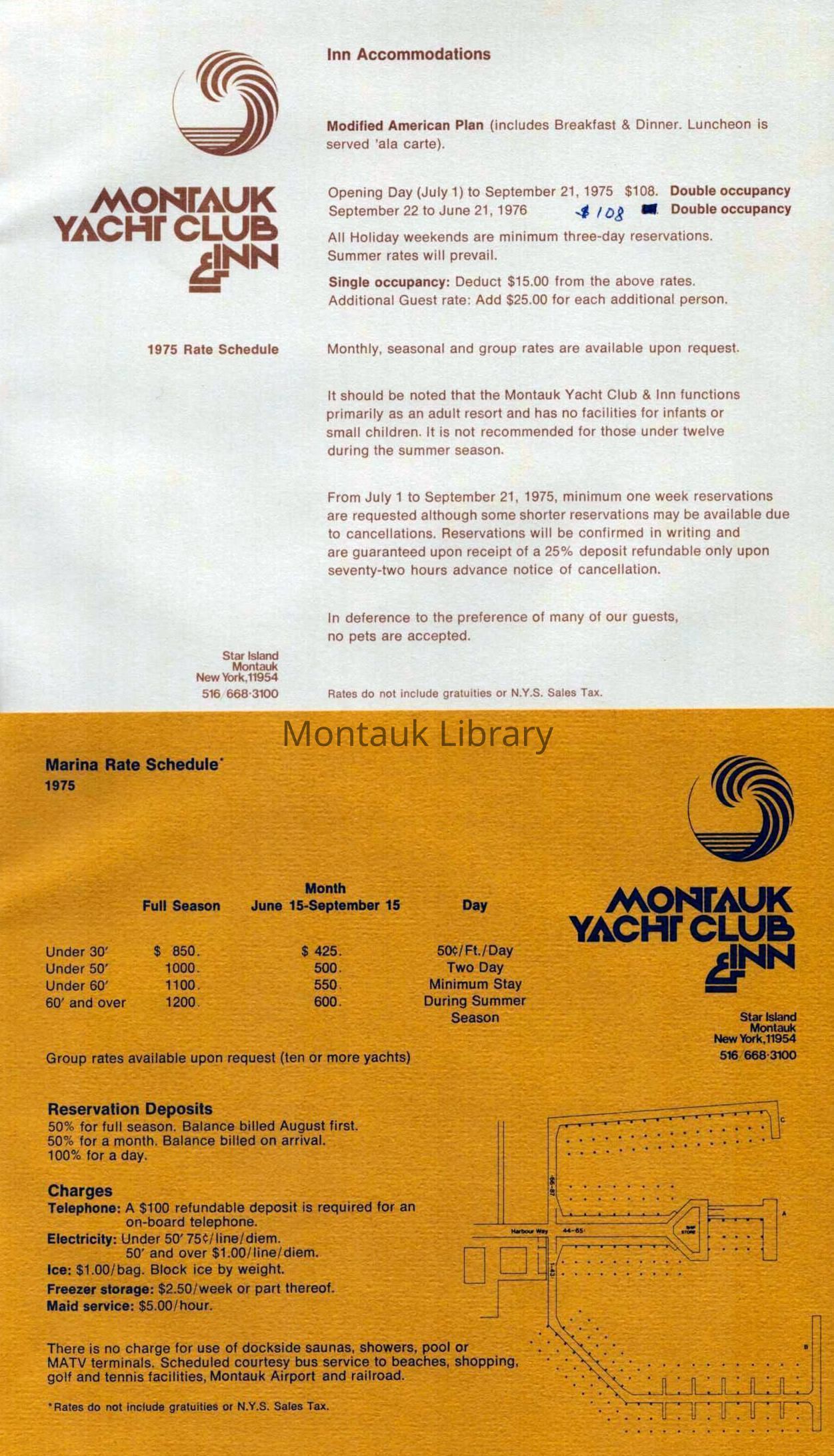 16-page booklet promoting amenities, activities, and services at the Montauk Yacht Club & Inn located on Star Island in Montauk. Includes two sheets with rates for 1975.Publication Details