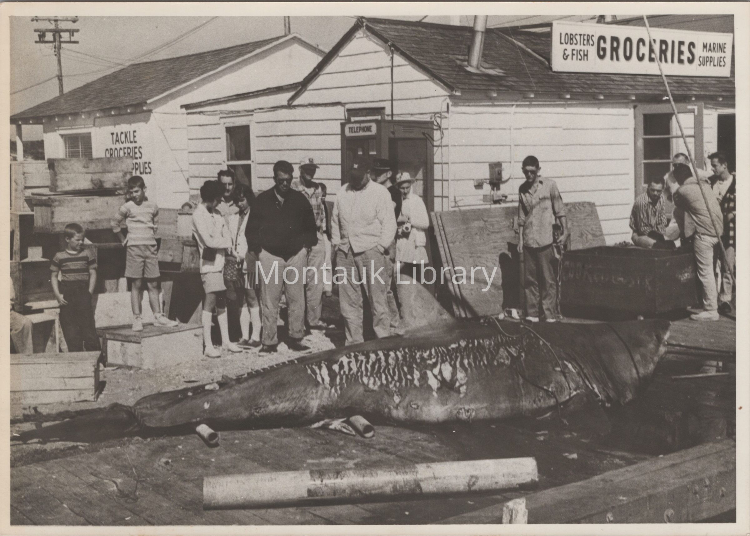 Black and white photograph showing shark on the Gosman's Bait & Tackle shop dock. Frank Mundus caught the shark in 1962 or 1963. The bait and tackle shop moved in 1963 to make room for the new fish house.Photograph Details