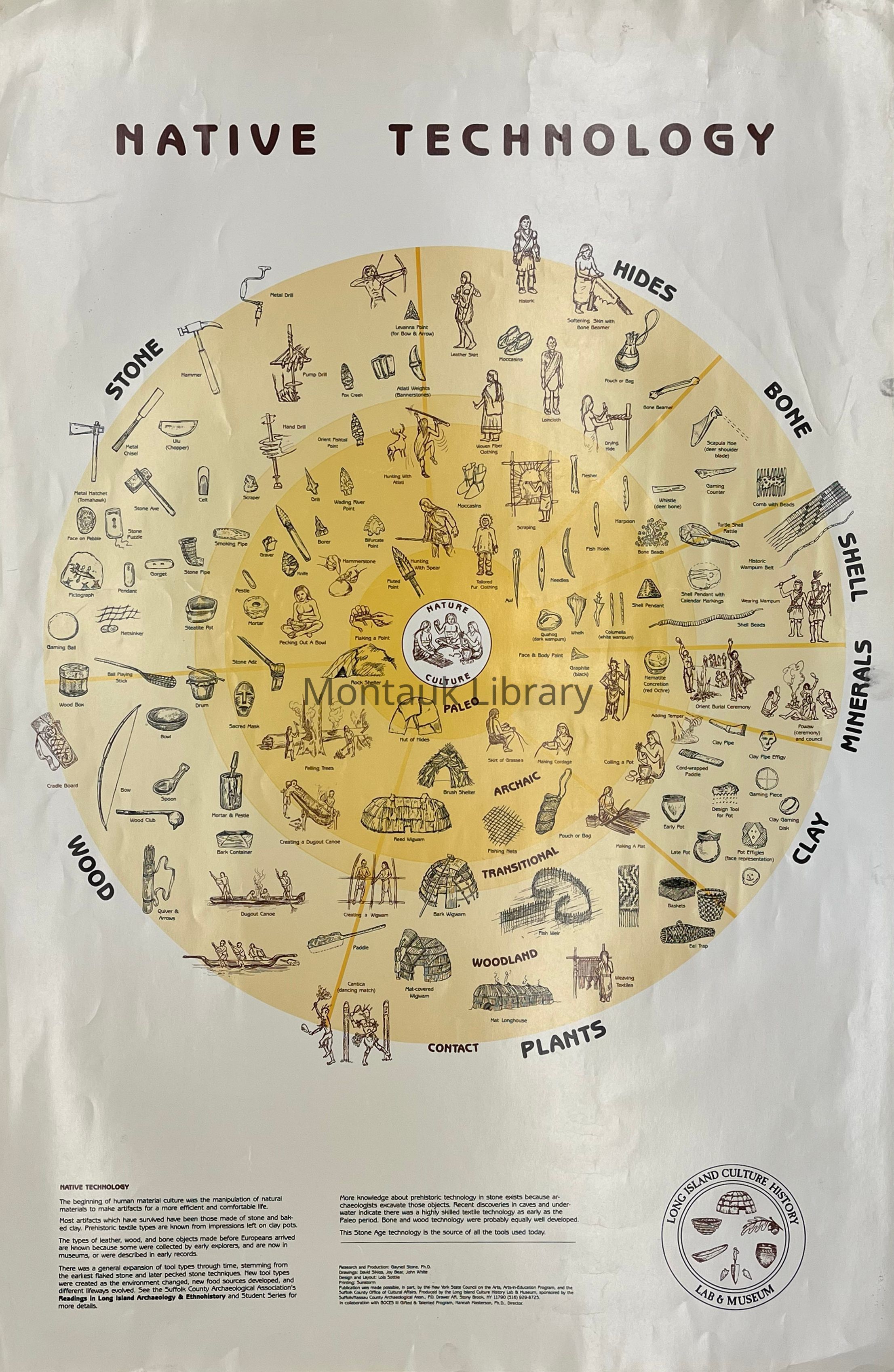 Two posters from the Long Island Culture History Lab & Museum depicting a map and technologies used by Native American Tribes on Long Island, New York. The Native Long Island map shows tribe and place names, languages spoken, locations of forts, wigwams, burial sites, planting fields and trails. The Native Technology poster shows how natural resources were processed and used for tools, housing, food, fuel, and functional objects.Made/Created