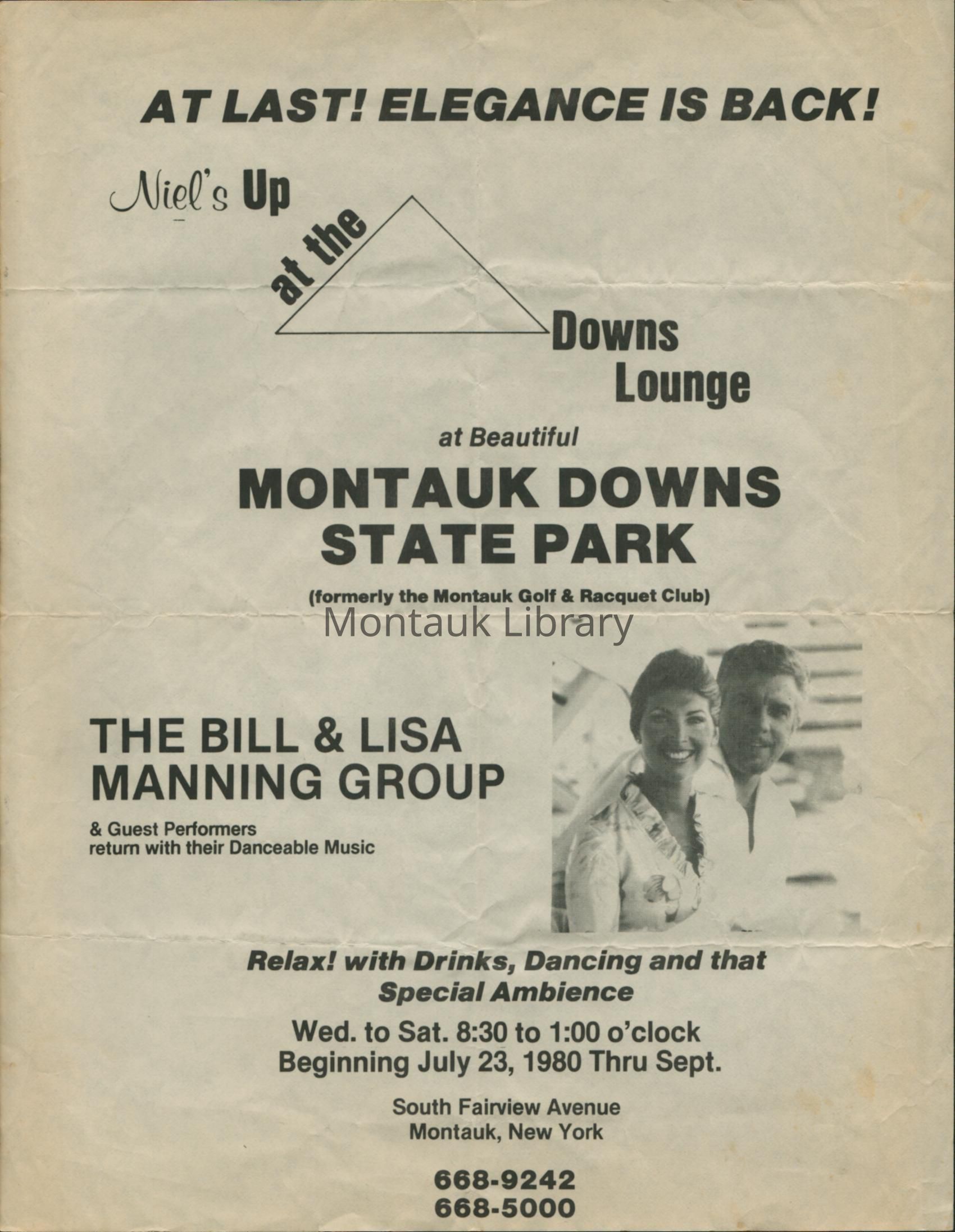 Flyer for Niel's Up at the Downs Lodge at beautiful Montauk Downs State Park, with the Bill & Lisa Manning Group and guest performers beginning on July 23, 1980 through Sept.Acquisition