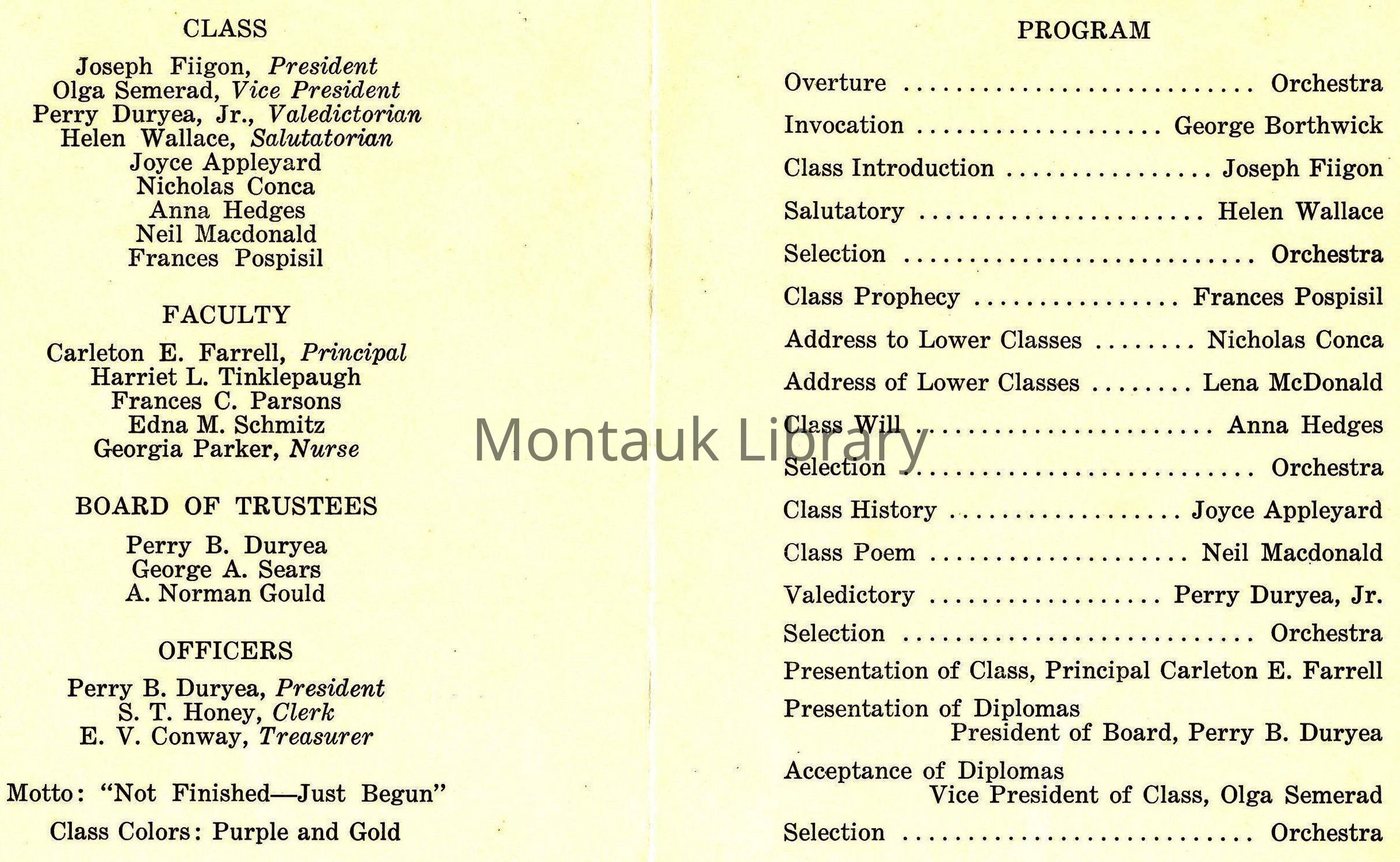 A collection of 17 digitized photographs, postcards, and a reproduction of the 1934 Montauk Public School grade commencement program. The photographs depict Perry B. Duryea, Jr. as a child, his father Perry B. Duryea, Sr., ice harvesting on Tuthill Pond, and unidentified men at a firing range. Ten of the photographs are color aerial views of Montauk Airport. Postcards include a World War II "Doughboy" and an image of the Fishing Village on Fort Pond Bay. The collection is undated but it is estimated the materials range from 1912 to 1990s.Archive Details