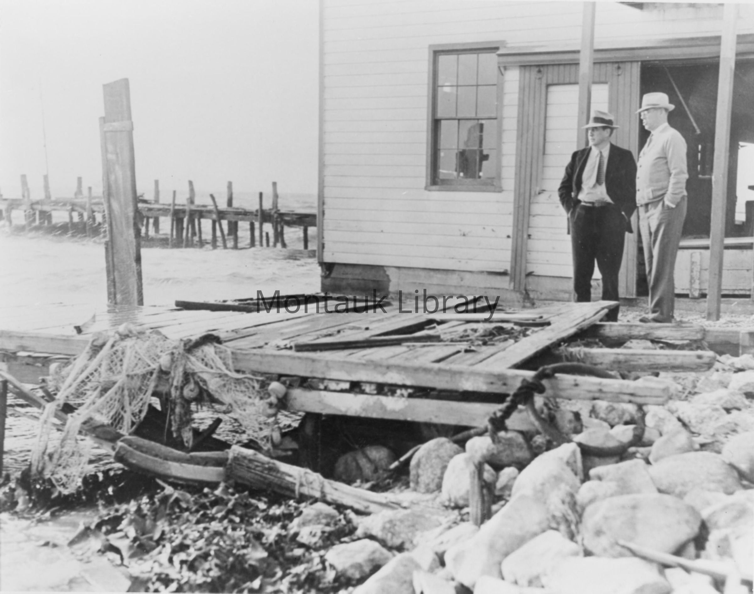 Photograph of Perry B. Duryea, Sr. and Long Island State Parks Commissioner Robert Moses assessing damage after 1938 hurricane on the docks at Fort Pond Bay, Montauk, NY.Acquisition