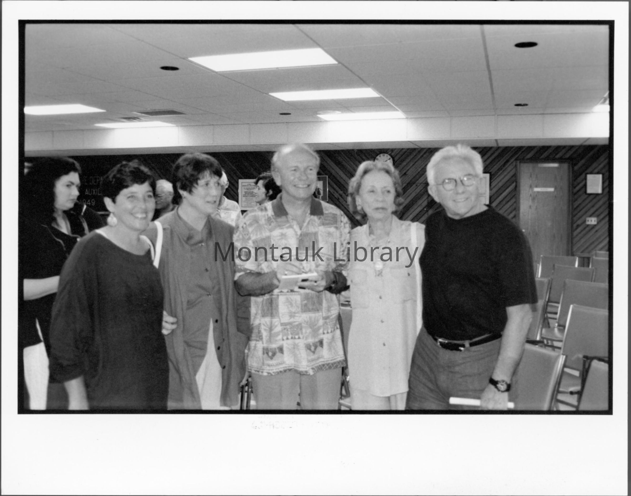 Photograph of Terence McNally reading at the Montauk Fire Department on July 22, 1995. Pictured left to right: Suzanne Gosman, Joanna Steichen, Terence McNally, Elaine Steinbeck, Joe Pintauro.Photograph Details