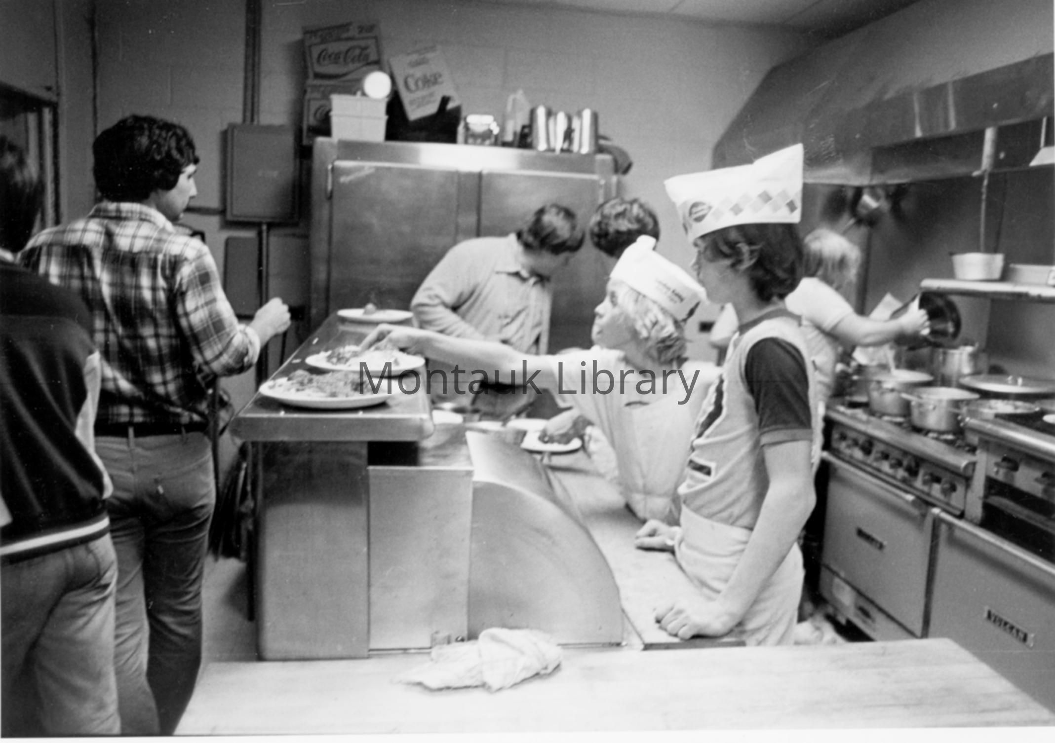 Photograph of young boys and Ray Walecko helping out in the Montauk Fire Department kitchen for an unidentified event, no date.Photograph Details