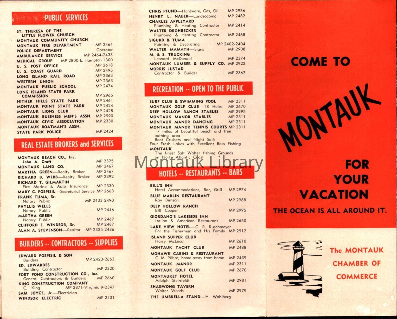A small collection of promotional printed materials and ephemera from Montauk restaurants, hotels, and the Montauk Chamber of Commerce from the 1950s to 1970s. Materials include brochures, event programs, postcards, napkins, menus, and hotel reservation rates. Businesses represented are the Montauk Manor, Bill's Inn, Uncle Tom's Cabins, the Beachcomber, and Margie's Cottages. The collection also includes a Montauk P.T.A. Cookbook and a program for the Miss Suffolk County Beauty Pageant, hosted by the Montauk Chamber of Commerce in 1974.