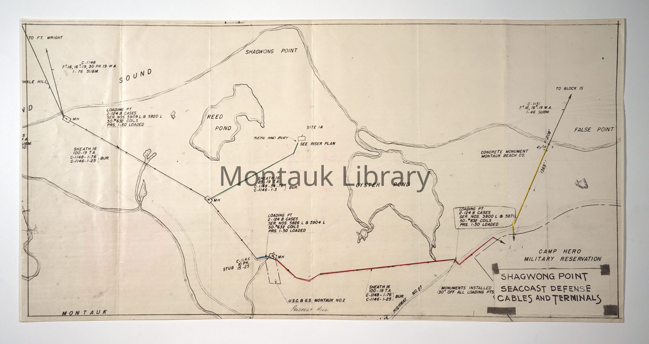 Map of the Shagwong Point Seacoast Defense Cables and Terminals, showing from the eastern shore of Lake Montauk to Camp Hero. Includes concrete monuments, Oyster Pond, Big Reed Pond, and Camp Hero Military Reservation.Map Details