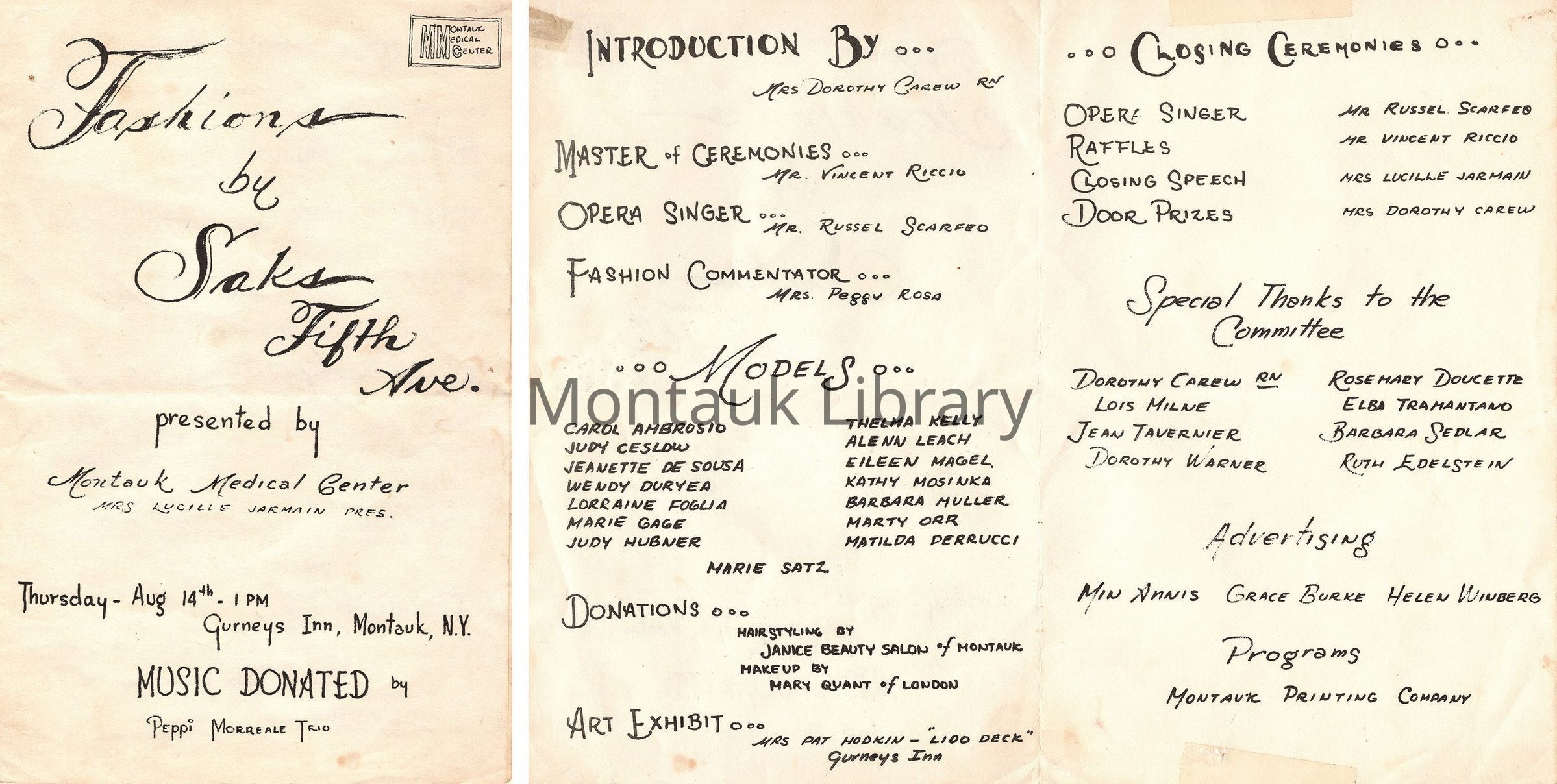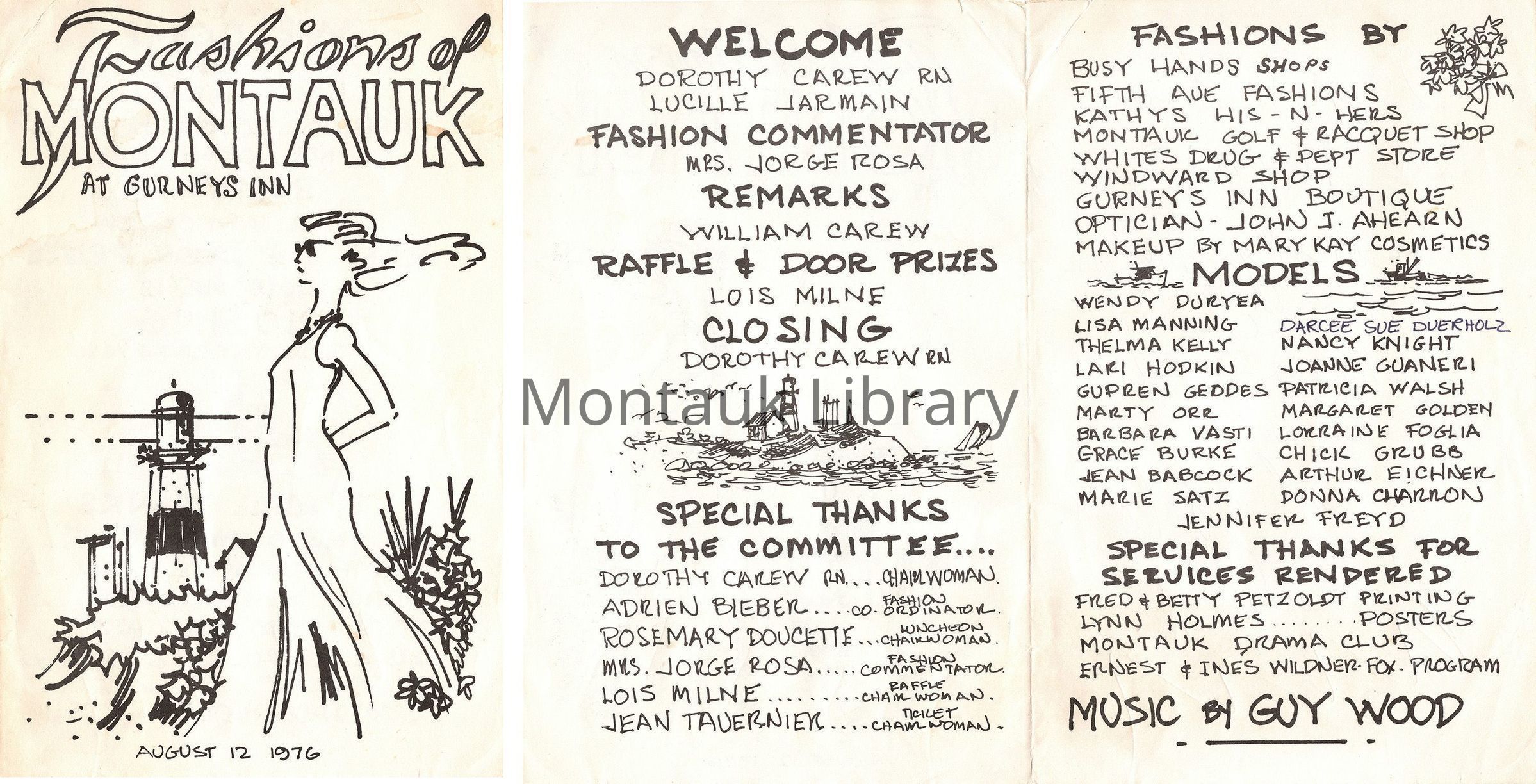 A small digital collection of two event programs and four photographs from the 1974 and 1976 fashion shows at Gurney's Inn benefitting the Montauk Medical Center. Thelma Kelly, a Montauk resident, and mother of the donor is the model in the four pictures from the 1976 benefit.Archive Details