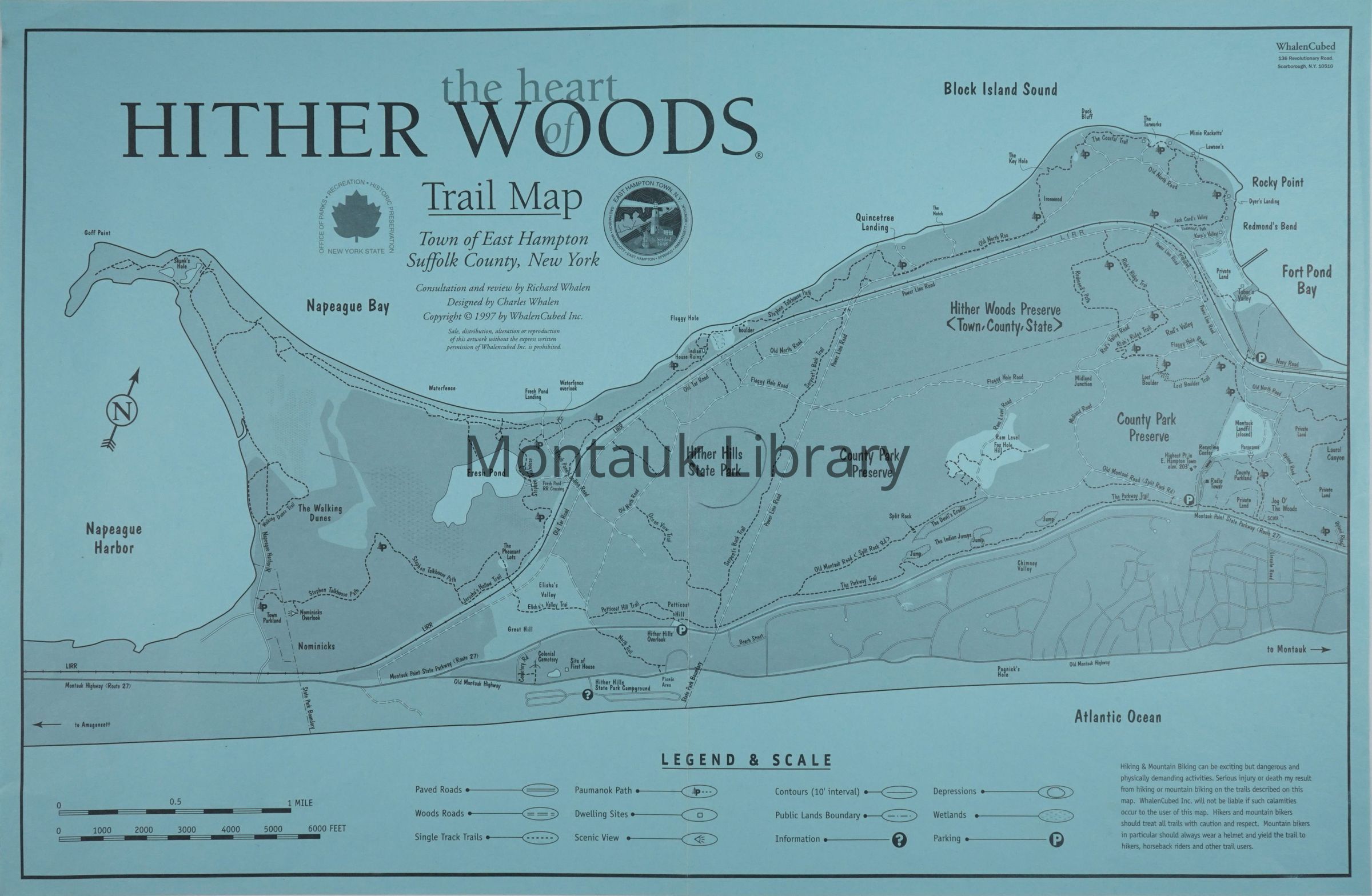 Trail map for the Hither Hills State Park, Hither Woods Preserve, and the County Park Preserve. The parklands are managed between Town, County, and State authorities .The map includes paved roads, woods roads, single track bike trails, dwelling sites, scenic views, wetlands, depressions, and parkings. Consultation and review by Richard Whalen, designed by Charles Whalen.Map Details