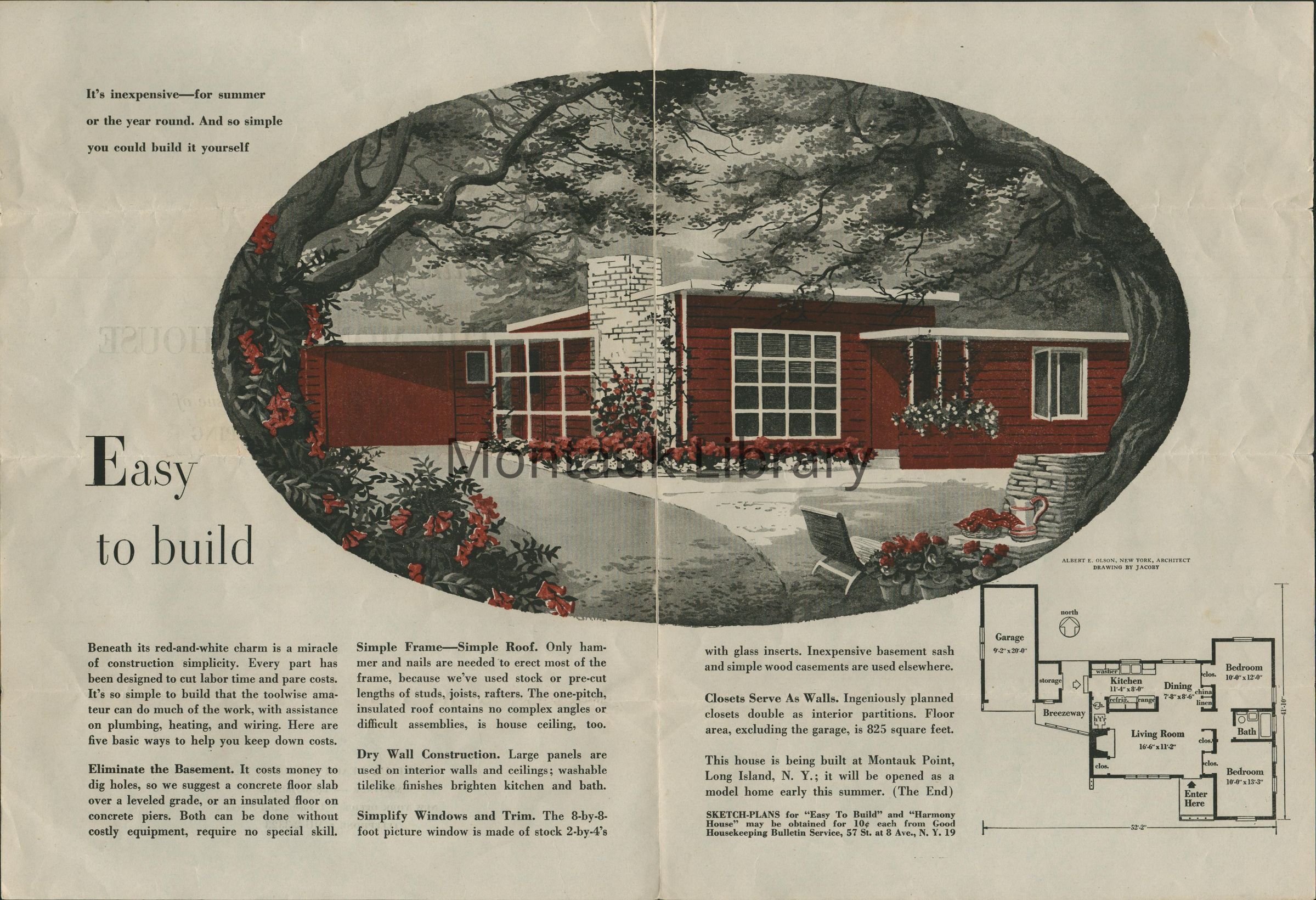 Bi-fold brochure presenting The Montauk House, as shown in the June issue of Good House Keeping. Published by the Montauk Beach Company Inc. Architect: Albert E. Olson. Easy to build and inexpensive summer houses being built at Montauk Point.Publication Details
