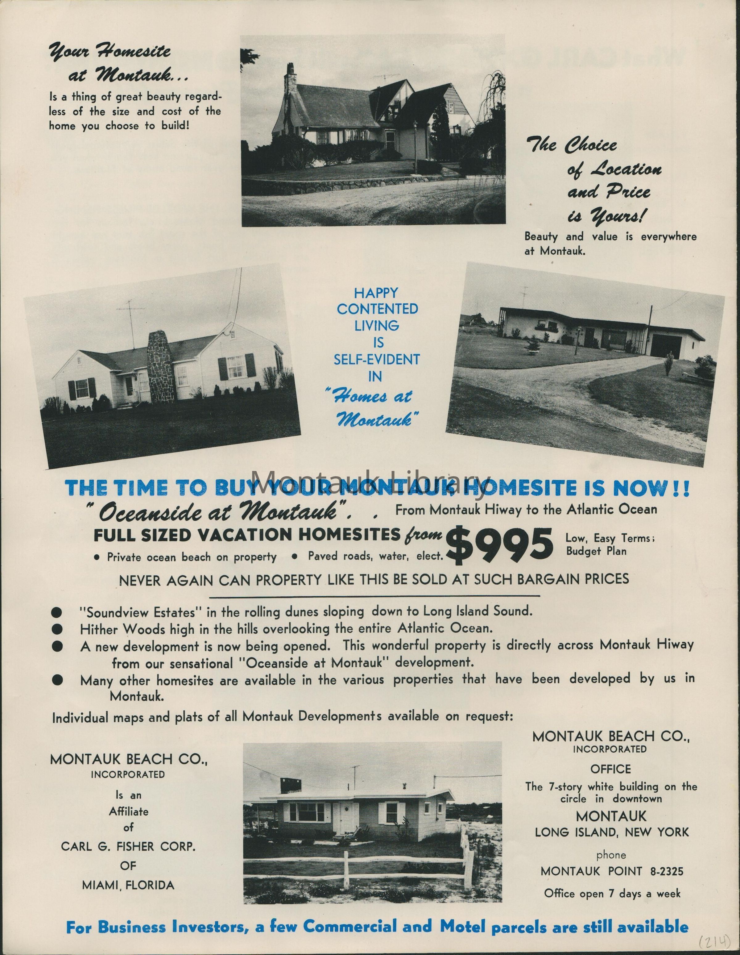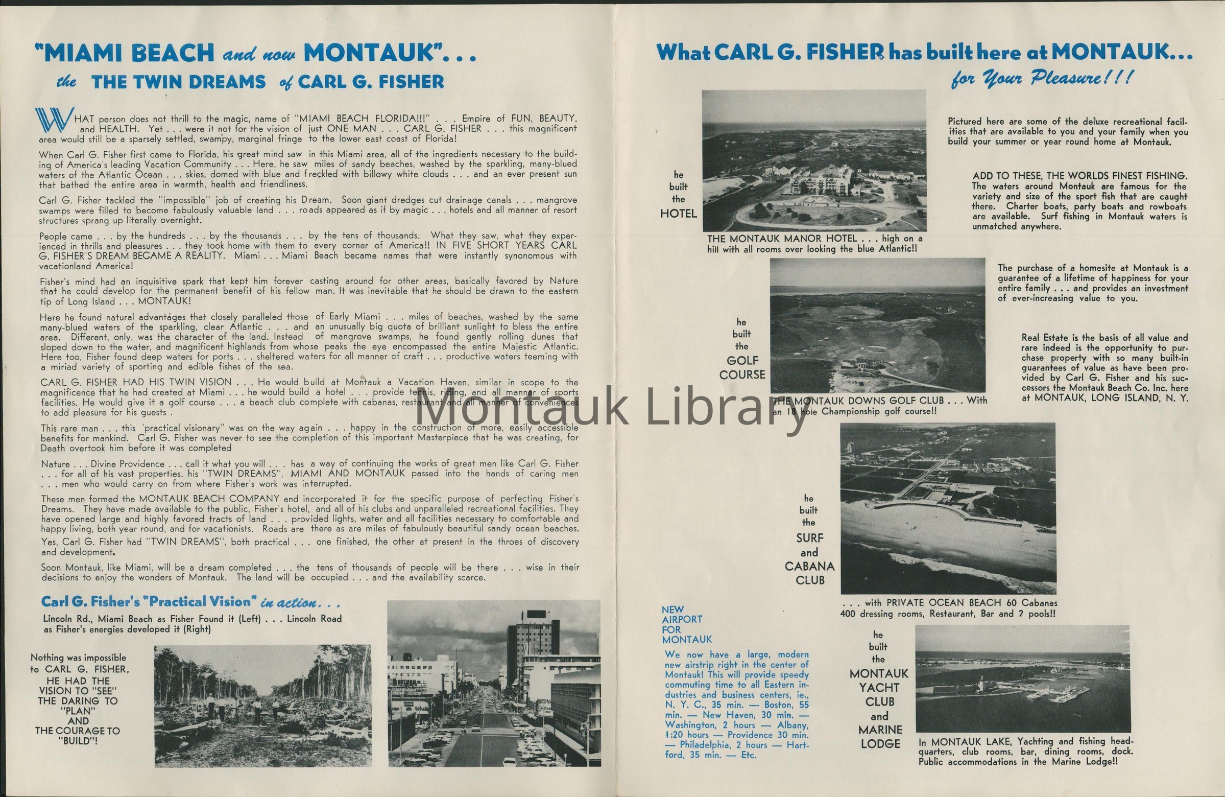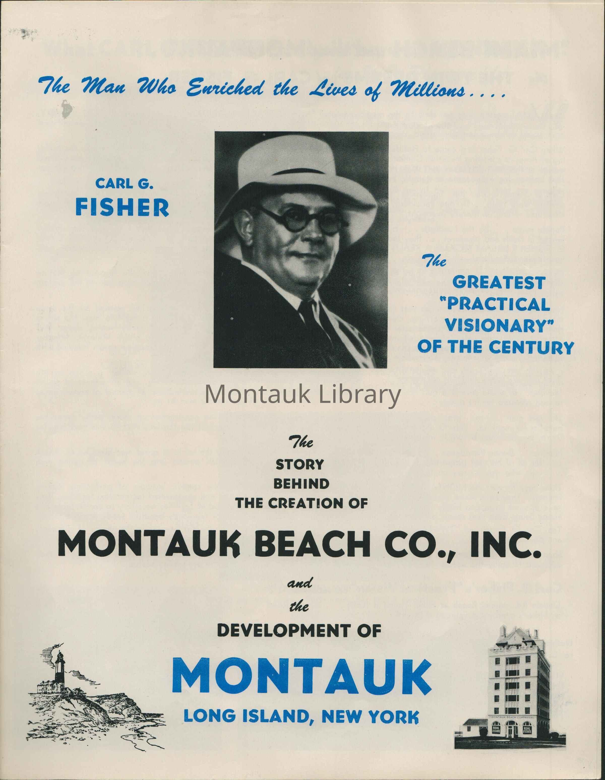 A promotional brochure celebrating Carl G. Fisher's accomplishments and developments throughout Montauk and Miami Beach. Includes advertisements for vacation homesites from $995. 4 pages.Publication Details