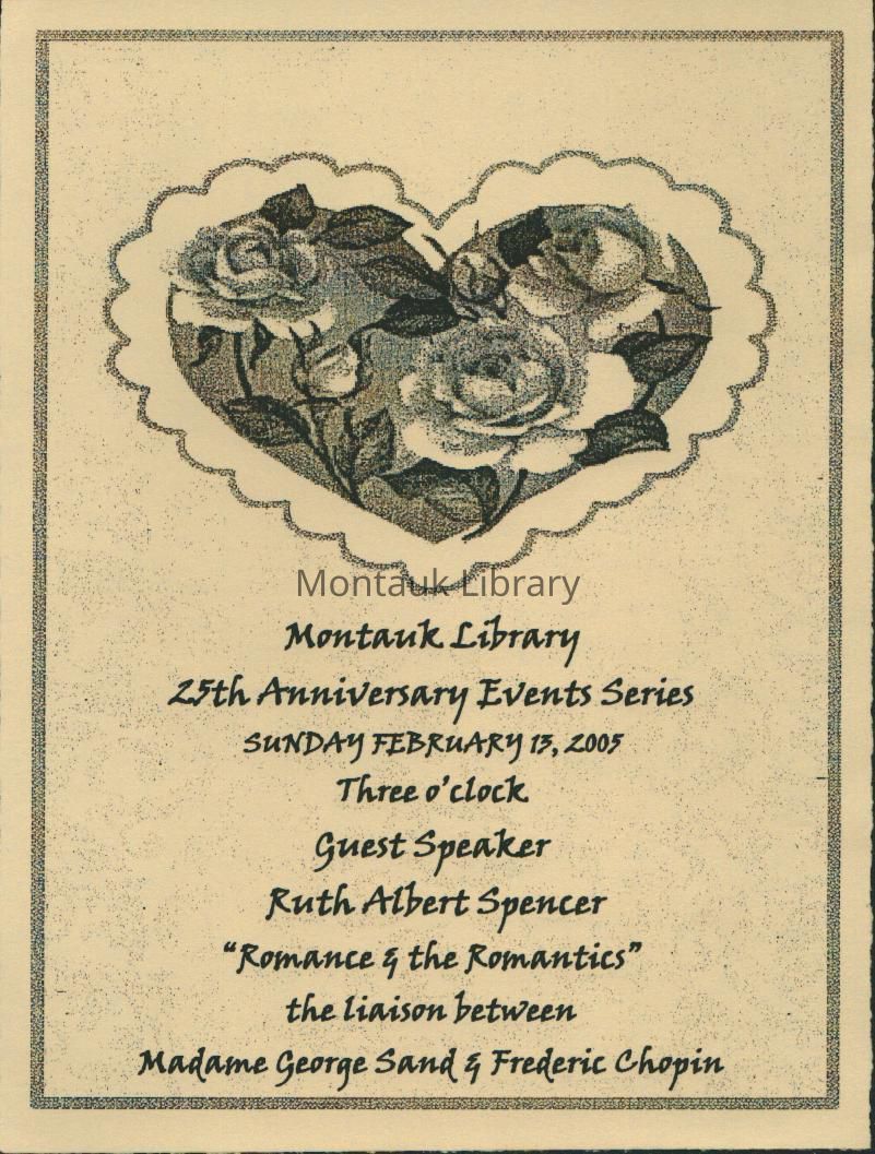 A collection of brochures, invitations, photographs, and event flyers from Tom and Peg Ambrosio, former Montauk Library Employees. The photographs, invitations, and event flyers document Montauk Library programs, book readings, and fundraising events. Brochures promote recreational activities in Montauk.Archive Details