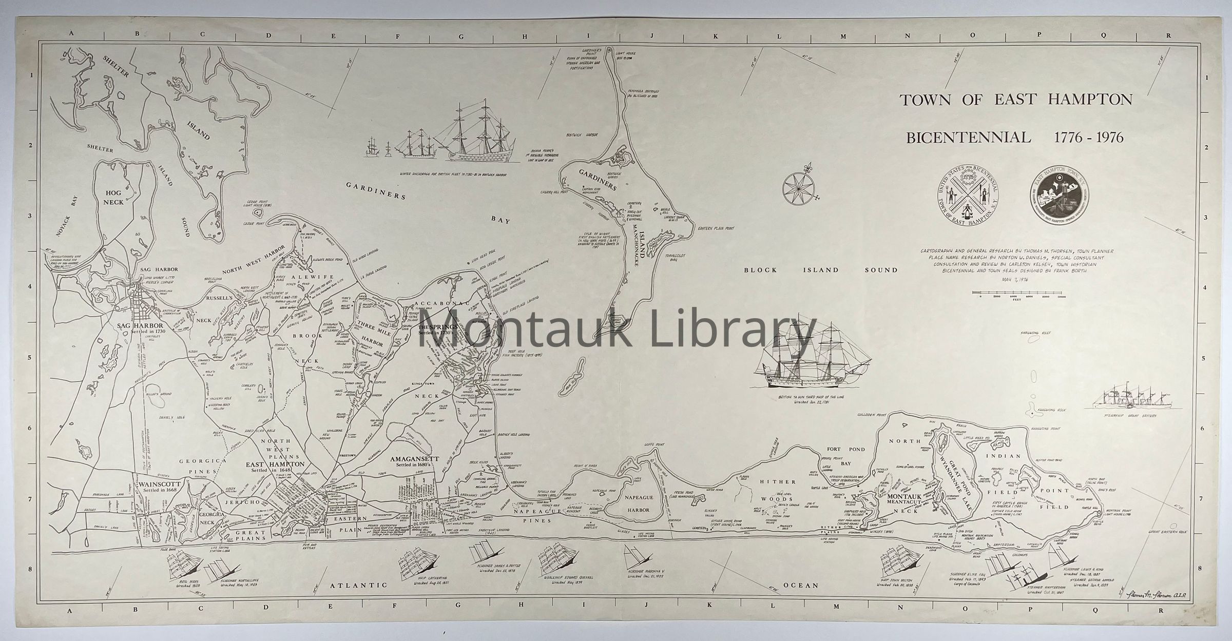 Map of East Hampton, including Sag Harbor, Wainscott, East Hampton, Springs, Amagansett, and Montauk created for the Town of East Hampton's Bicentennial celebration in 1976. Cartography and general research by Thomas M. Thorsen, Town Planner. Place name research by Norton W. Daniels, Special Consultant. Consultation and review by Carleton Kelsey, Town Historian. Bicentennial and town seals designed by Frank Borth. May 7, 1976Map Details