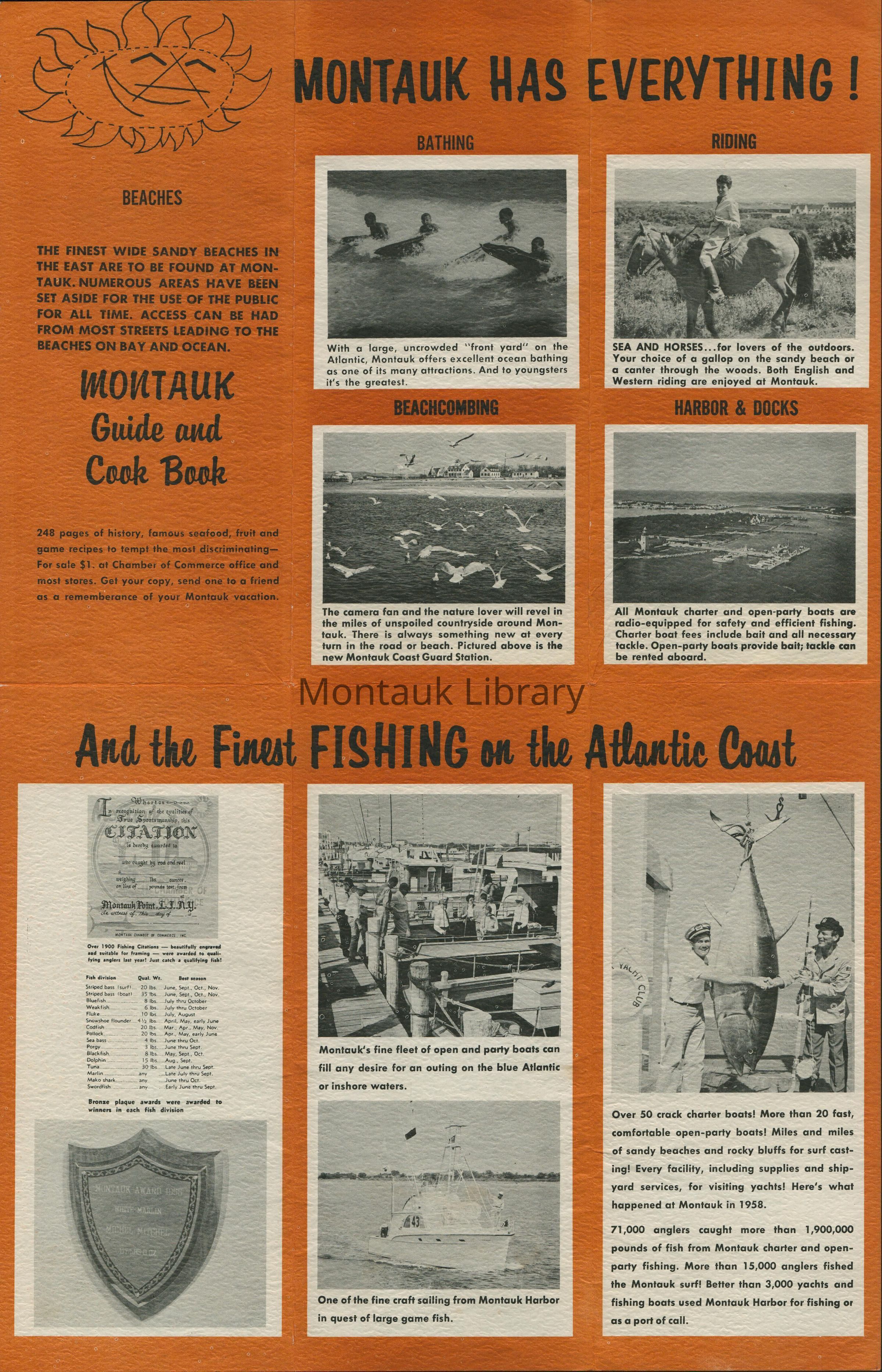 Brochure from the Montauk Chamber of Commerce promoting Montauk's beaches, fishing, riding, motels, churches, and carefree life.Publication Details