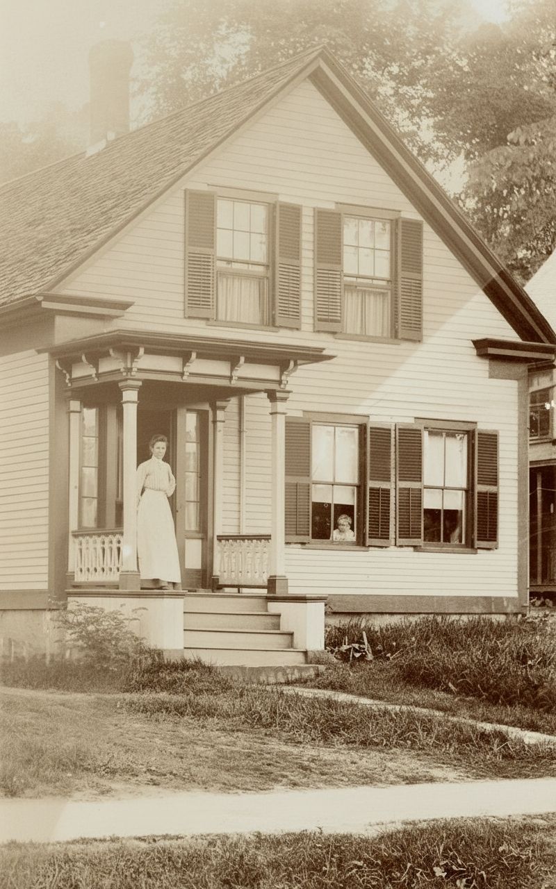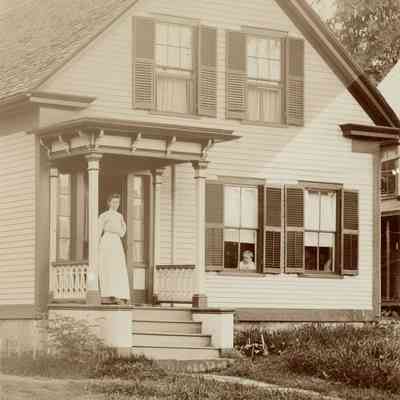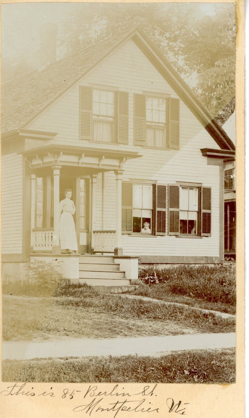Photograph of the house at 85 Berlin Street with a woman standing on the porch and a child looking out the window. Photographic print is glued to a postcard backing. Similar photographs in the neighborhood were taken between 1893 and 1898.Photograph Details