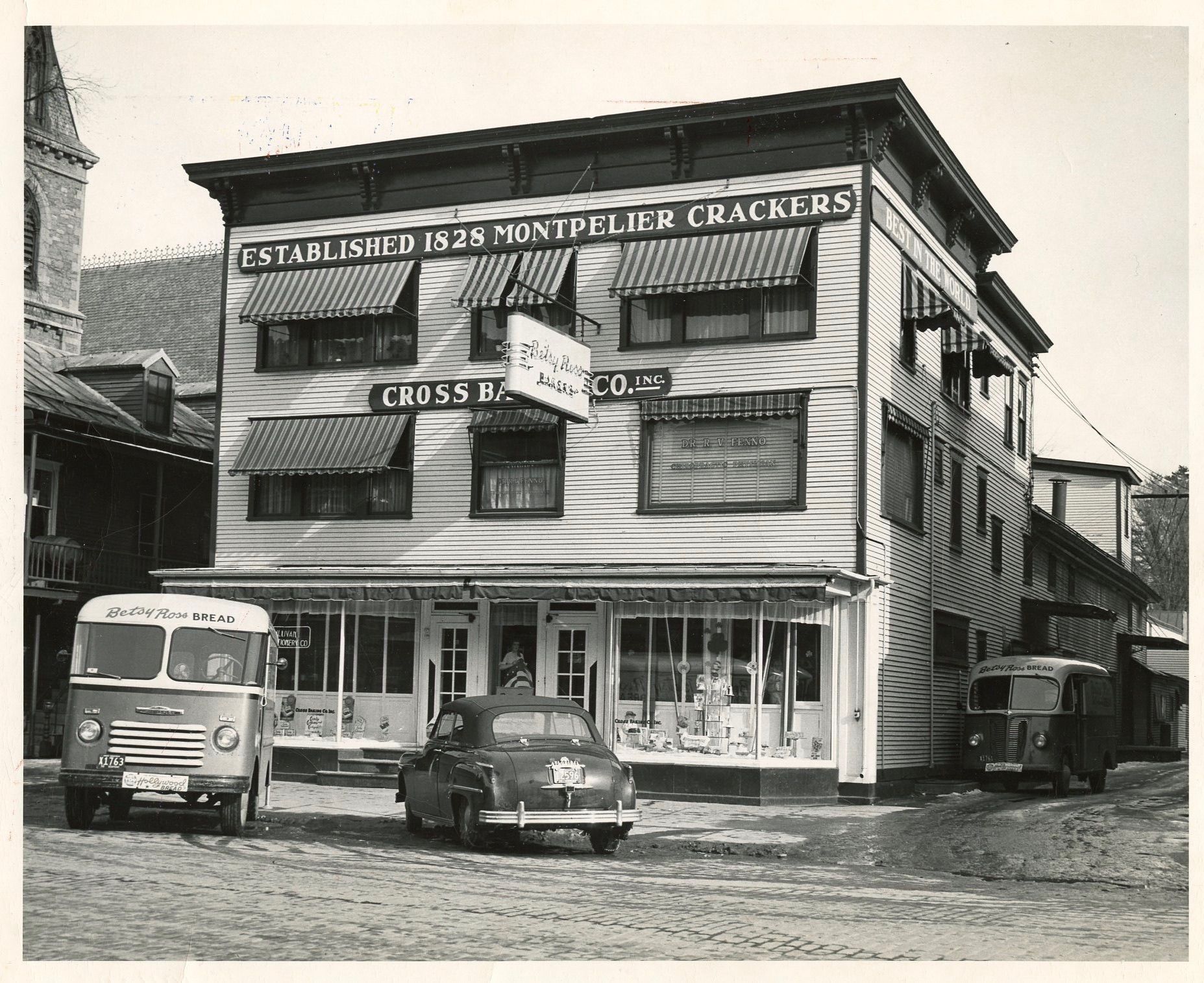 Photograph of the Cross Baking Co., building at 101 Main Street, Montpelier, in 1952. Bethany Congregational Church can be see at the left edge of the photograph. Two delivery vans and one automobile are in the photograph. The building was disassembled in 1984 to make room for a new building known as City Center.Photograph Details