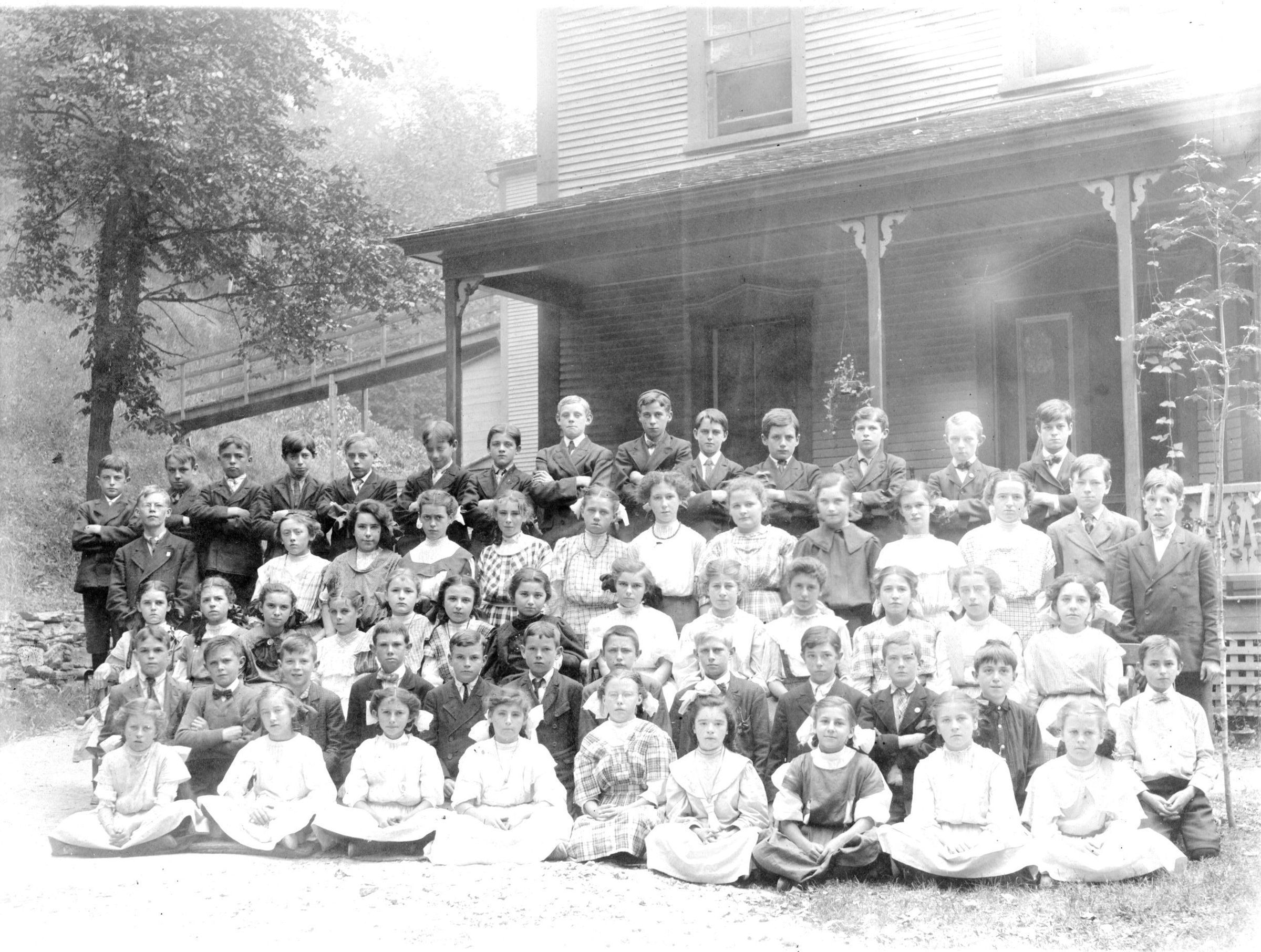 Five rows of students of undetermined age in front of their school, a wood frame building with a porch on front, the first Catholic school in Montpelier, Vermont.Photograph Details